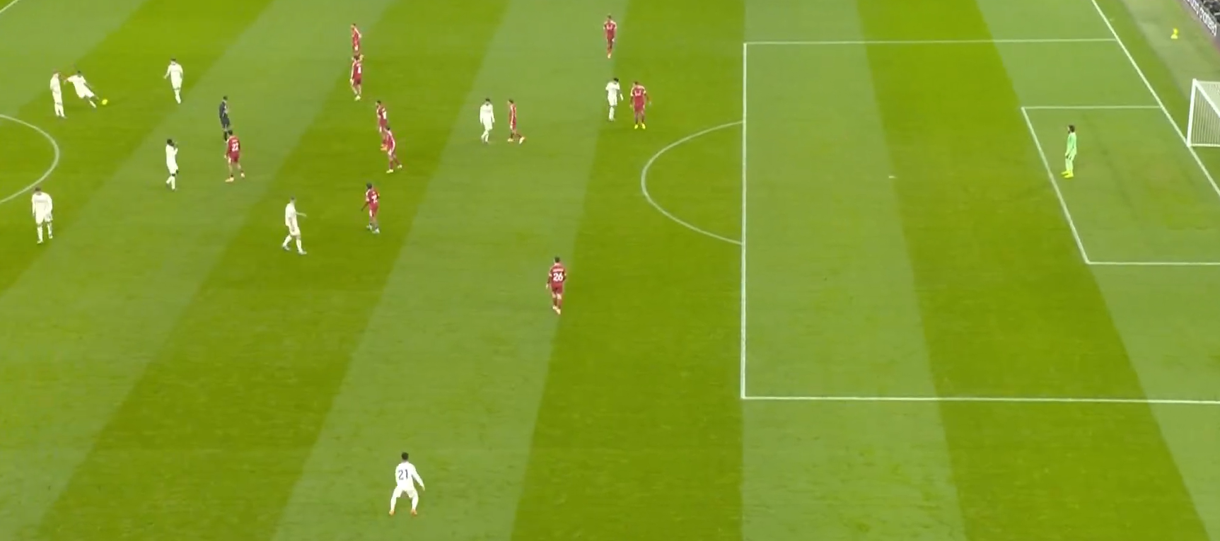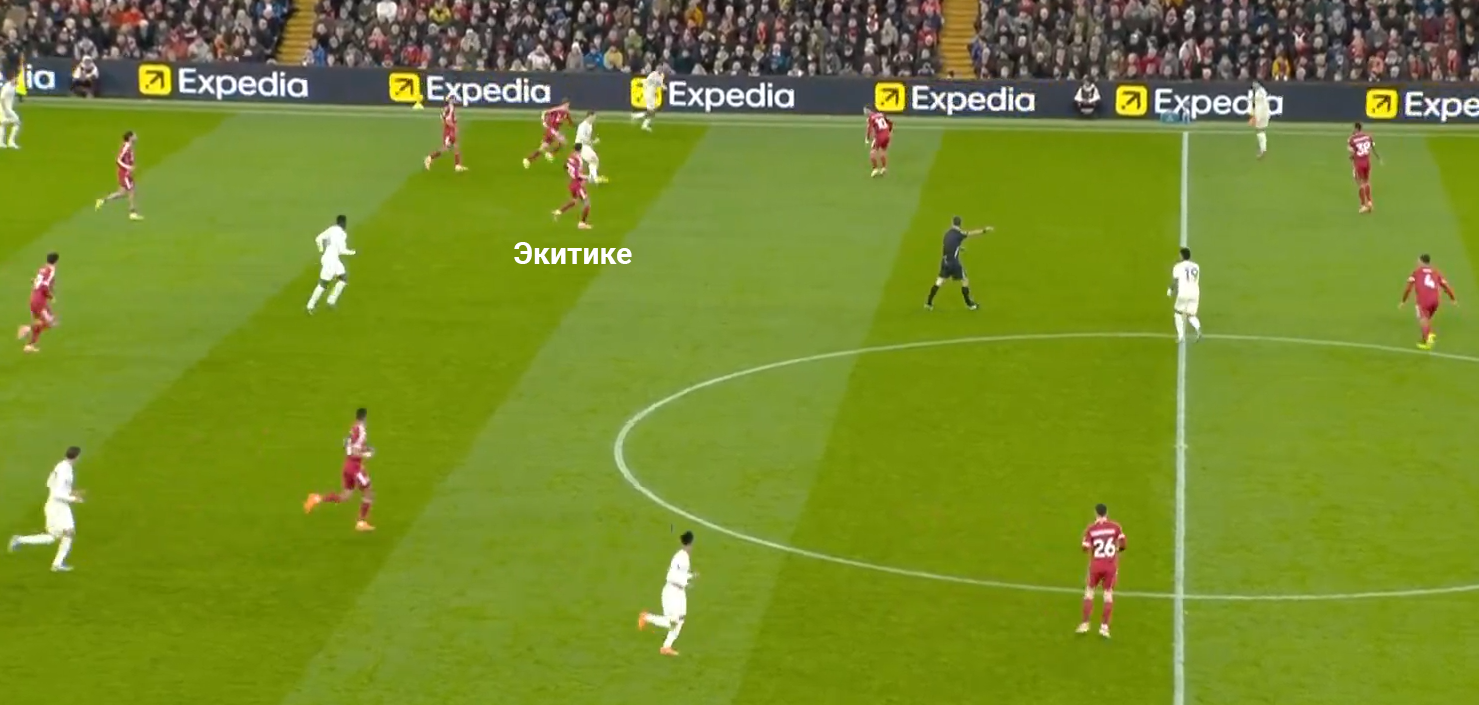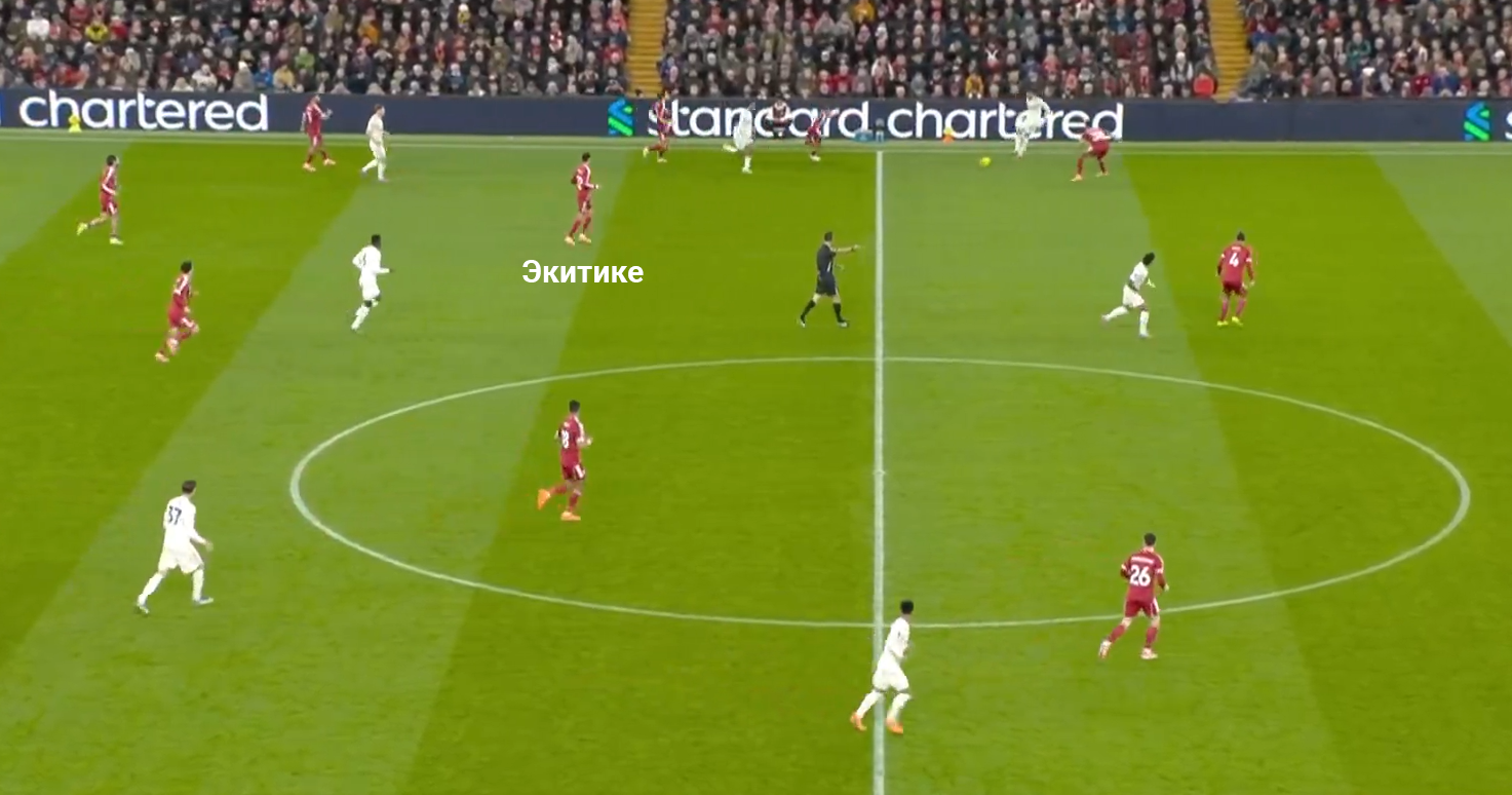 Я понимаю эту ротацию: центральный защитник в лице Ван Дейка тащит мяч, скидывает на крайнего защитника и сам немного продолжает идти вперед и остается в опорной. Так защитник уводит нападающего и создает небольшую зону Керкезу (кз) для паса или захода внутрь опорной, где кста хорошо открыта дальняя нога Гравенберха (Керкез отдаст пас назад вратарю).