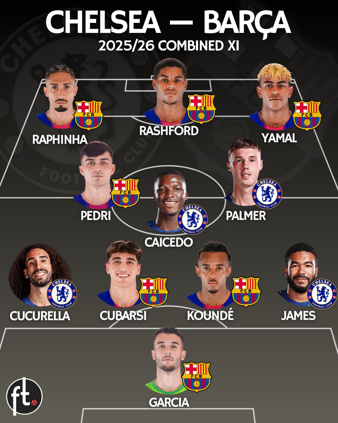 У каталонцев численный перевес: Рафинья, Маркус Рэшфорд, Ламин Ямаль, Педри, Пау Кубарси, Жюль Кунде и Жоан Гарсия. Лондонцев в команде представляют Мойсес Кайседо, Коул Палмер, Марк Кукурелья и Рис Джеймс.