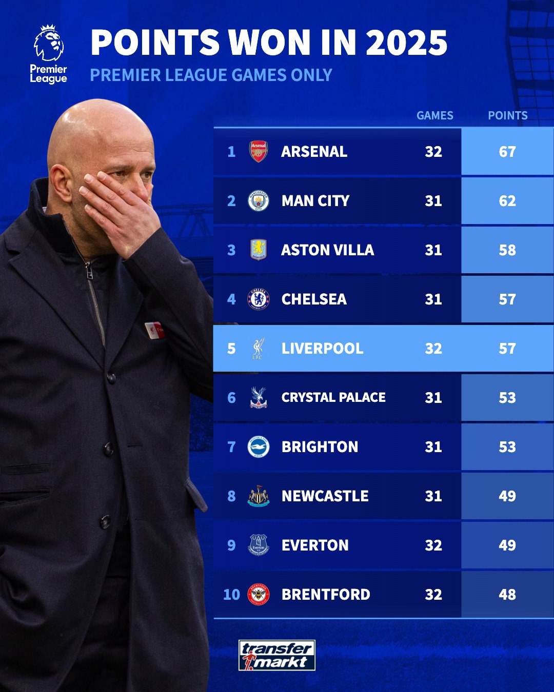 Всего за 2025 год «Ливерпуль» набрал 57 очков, подсчитали эксперты Transfermarkt. Даже с учетом чемпионства в минувшем сезоне, по общему зачету за календарный год такой результат отправляет подопечных Арне Слота на пятую строчку среди всех команд английского первенства.
