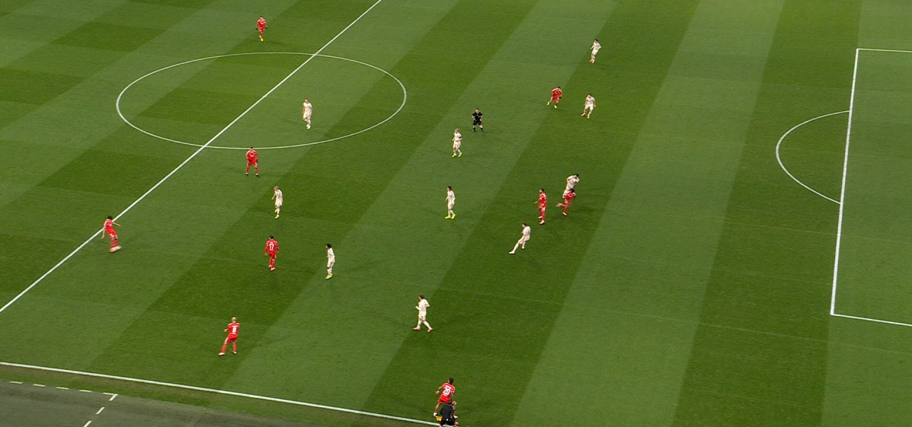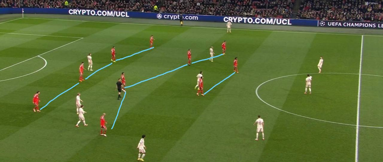 После гола Бенфика стала действовать куда прагматичнее. Линия прессинга опустилась чуть ниже, интенсивность снизилась, но структура осталась прежней - команда просто перешла в режим экономии, сохранив при этом контроль над пространством.