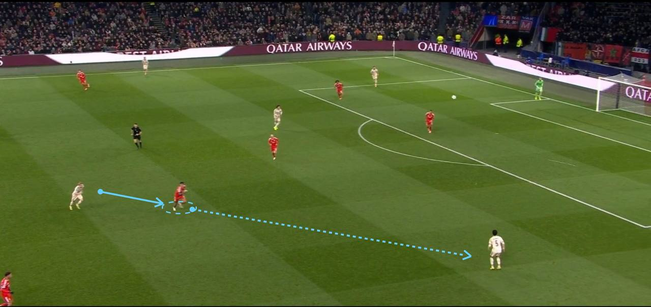 Стал одним из ключевых игроков матча - и не только благодаря удару, приведшему к первому голу. Он проделал огромный объём работы в прессинге, помогал при выходе из обороны, закрывал зоны и активно участвовал в продвижении мяча. Его рывки в прессинге несколько раз сбивали ритм Аякса и создавали моменты для перехватов.