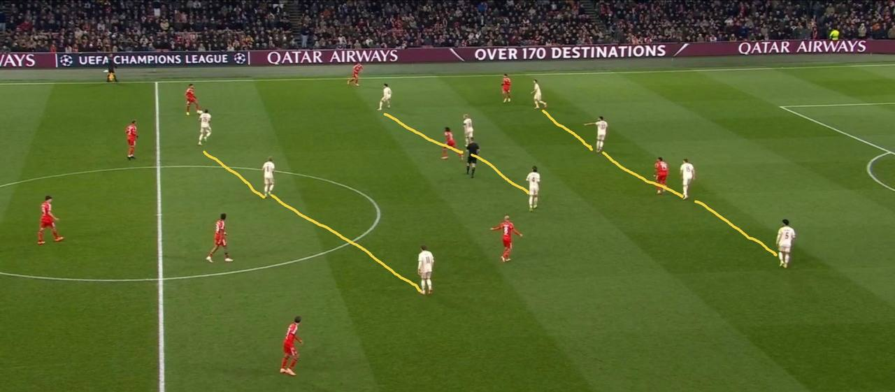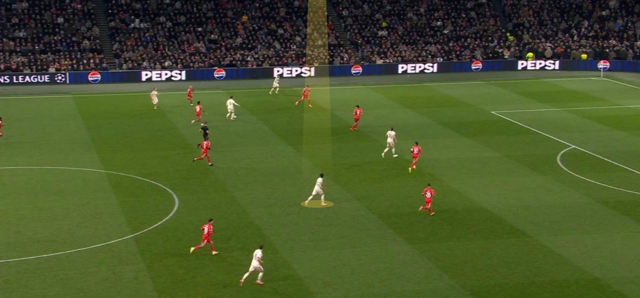 Когда Бенфика садилась в позиционную оборону, структура становилась ещё более показательной - классическое 4-4-2, но с очень плотными горизонтальными линиями. Полузащитники не позволяли Аяксу играть между линиями, оставляя лишь возможность атаковать через фланги или длинные забросы на Вегхорста.