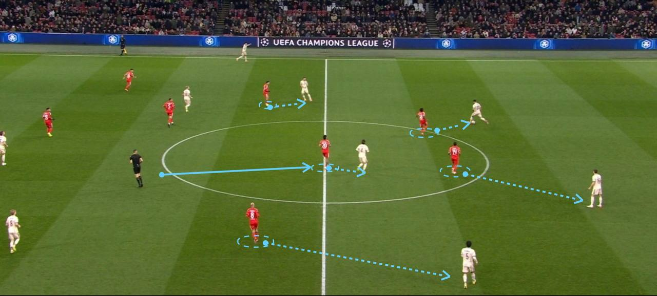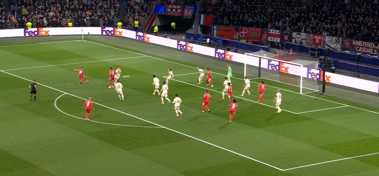 Бенфика не просто вышла прессинговать - команда выстроила хорошо отлаженную структуру давления. Пятёрка игроков поднималась высоко, синхронно перекрывая линии передачи и вынуждая защитников Аякса принимать решения в условиях постоянного давления. Павлидис и Баррейру активно атаковали центральных защитников, не давая им даже секунды лишнего времени, а Риос поднимался на линию под ними, поддерживая напряжение и страхуя зону.