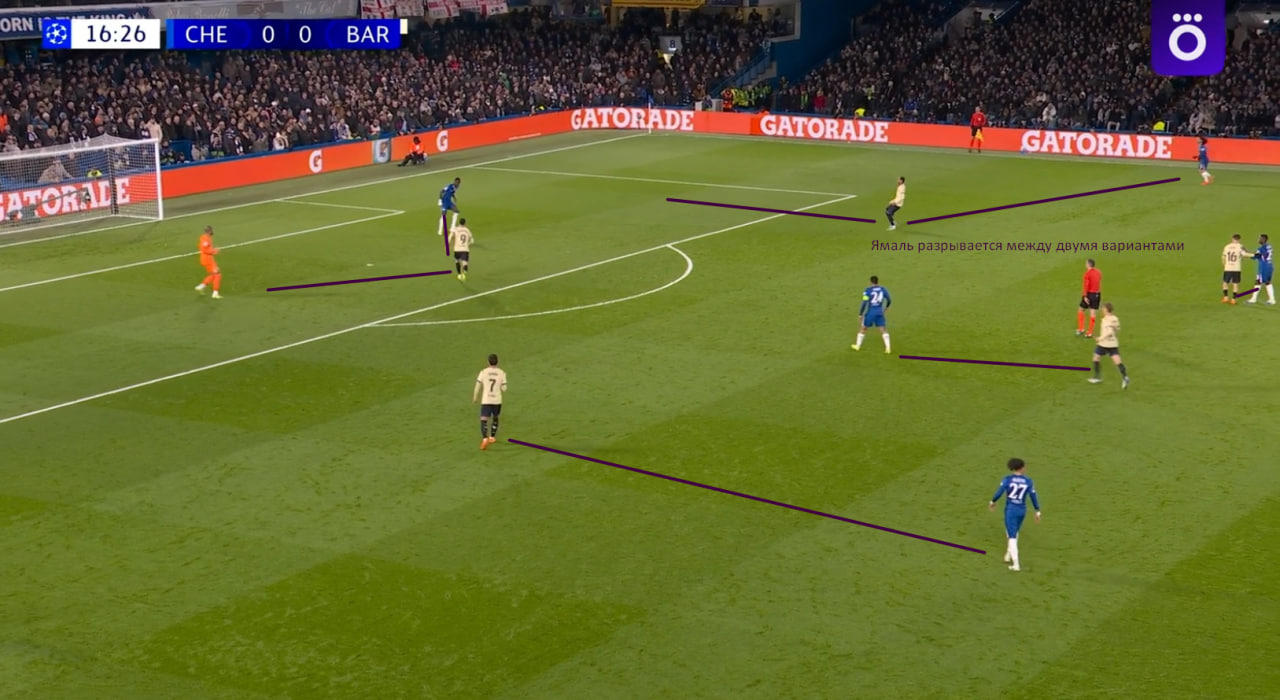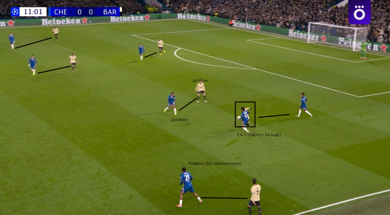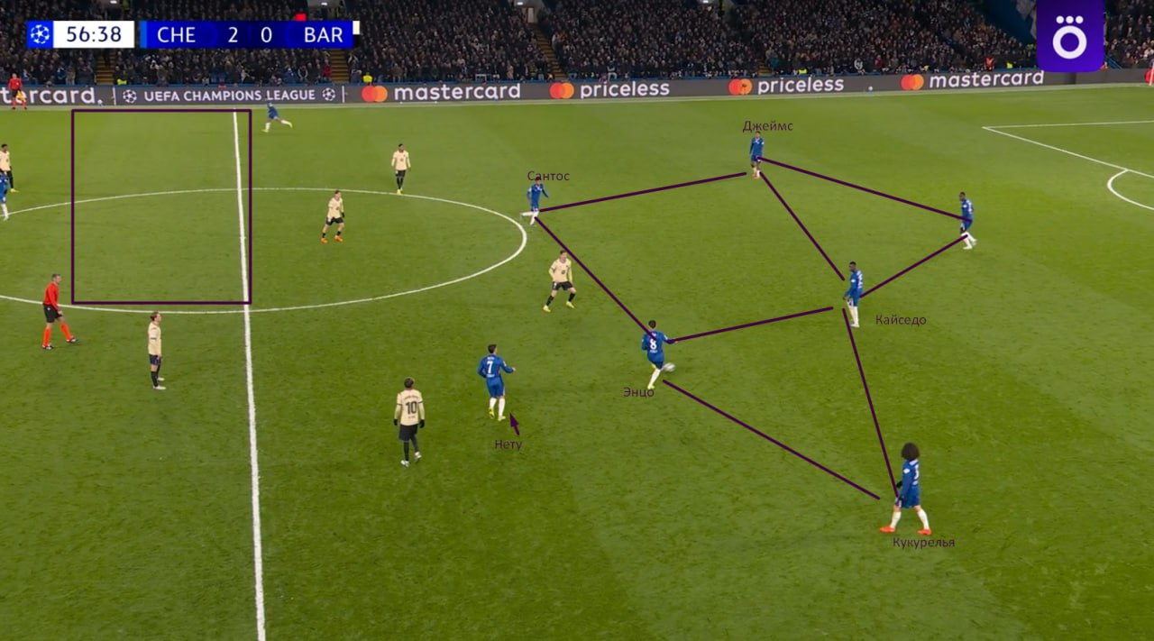 Вообще, в этом матче «Челси» делал много неудобного для «Барселоны» в давлении: прессинговал до упора, активизировал давление при получении мяча со стороны Араухо, так еще и в последней линии умело передавал опеку, что давало дополнительного страхующего игрока в момент переходной фазы. Удивительно, но «Барселона» ничего противопоставить не смогла, и не только в этом компоненте.