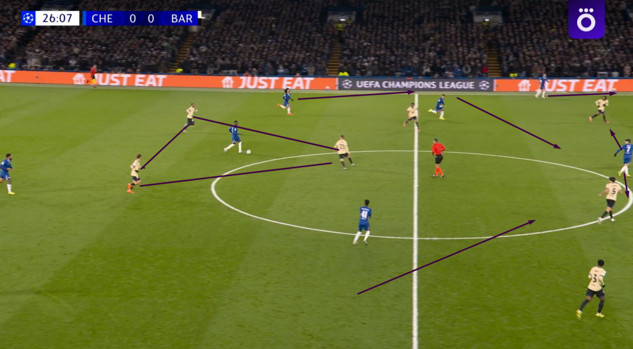 Команда Марески же очень грамотно растягивала вариацию соперника (вингеры и центральные игроки порой теряли позицию для основных задач), при определенных сигналах происходила атака более вертикальных зон (игроки ситуативно разрывались в расчете опеки, структура «лондонцев» хорошо сбалансирована и эффективна в нескольких красках), или же в момент провала прессинга «Челси» проходил через уязвимое амплуа в структуре «Барселоны».