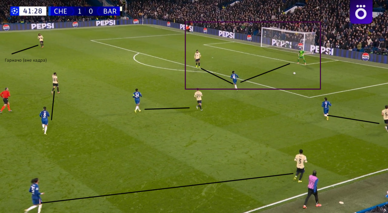 С учетом того, что «Барселона» играла в меньшинстве, структура выпада зависела от индивидуальных скиллов при розыгрыше (не хватало Педри и Кристенсена изначально) – вариация провалилась количественно и качественно, «Челси» легко адаптировался к более простому продвижению с сохранением главных принципов, после определенных попыток команда Флика отдала мяч.