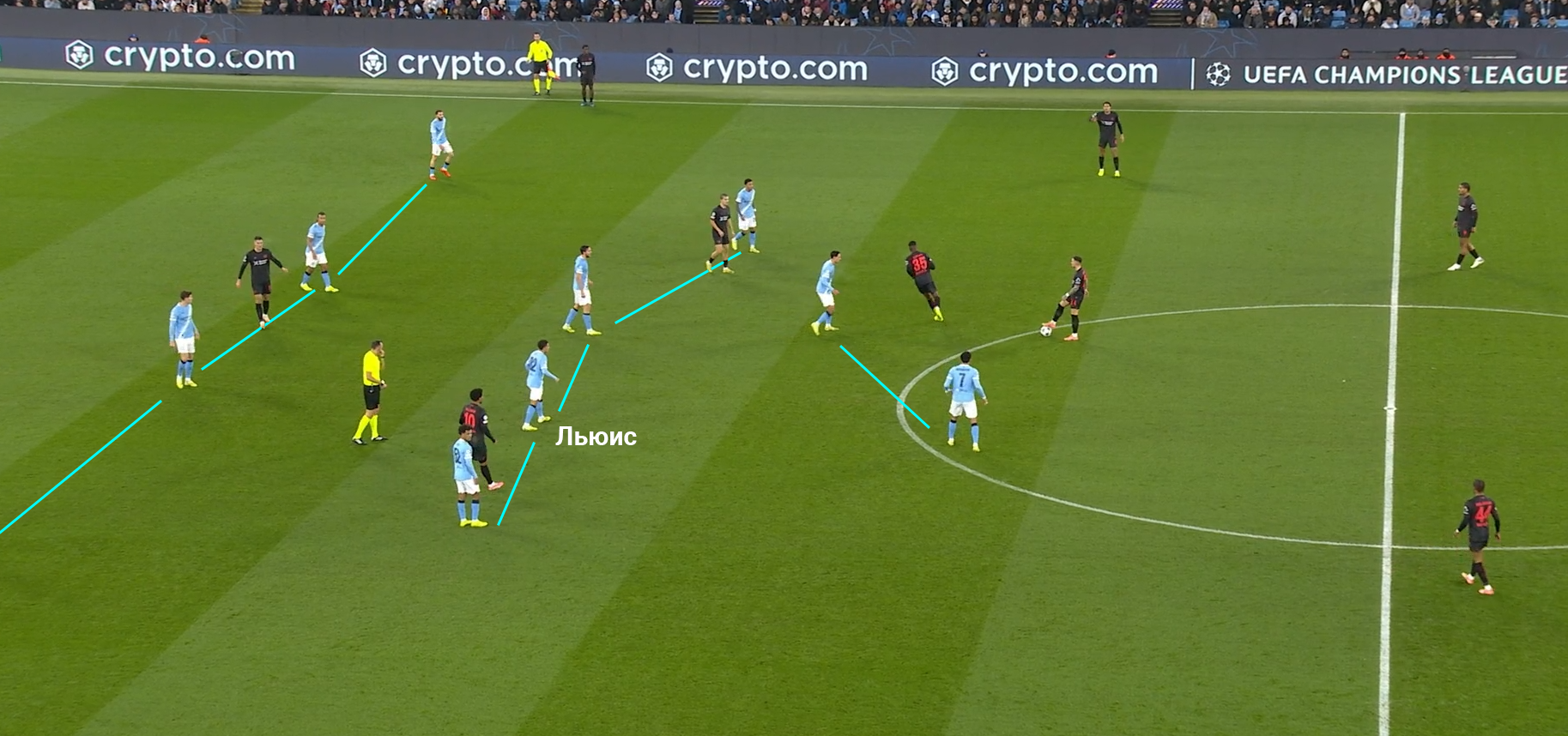 Пас игрока Байера назад — триггер для Сити. По этой передаче все игроки выдвигались в прессинг. Особенно высоко выдвигался Льюис. Логика понятна: англичанин шел вперед, чтобы 3 защитника гостей не смогли разыграть большинство (3в2) в первой стадии):
