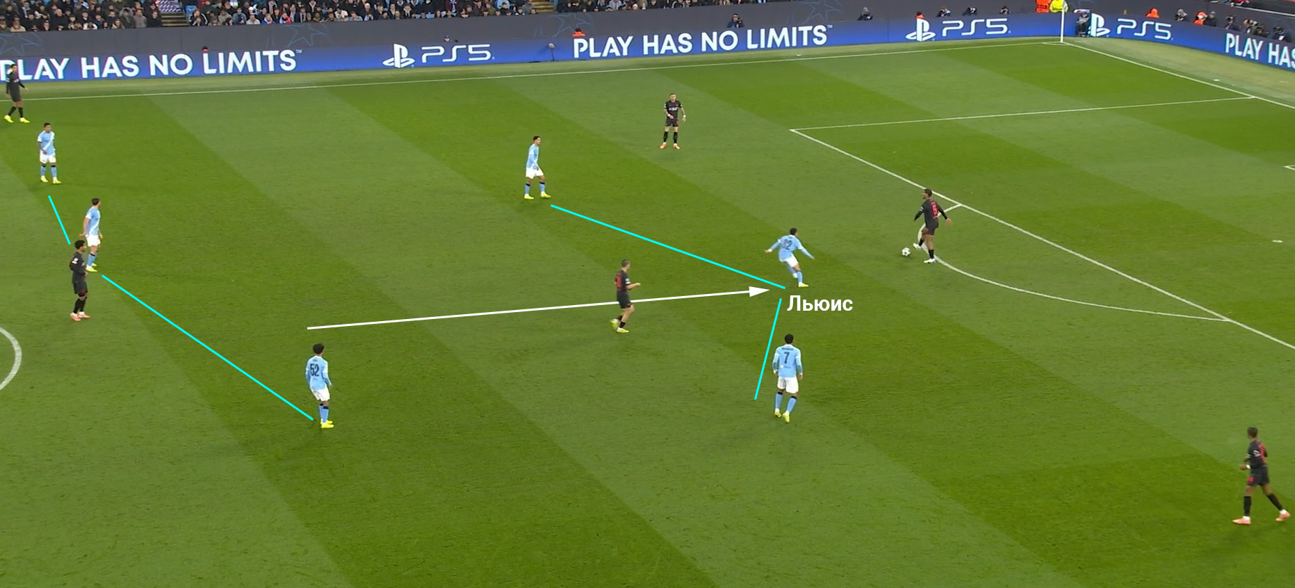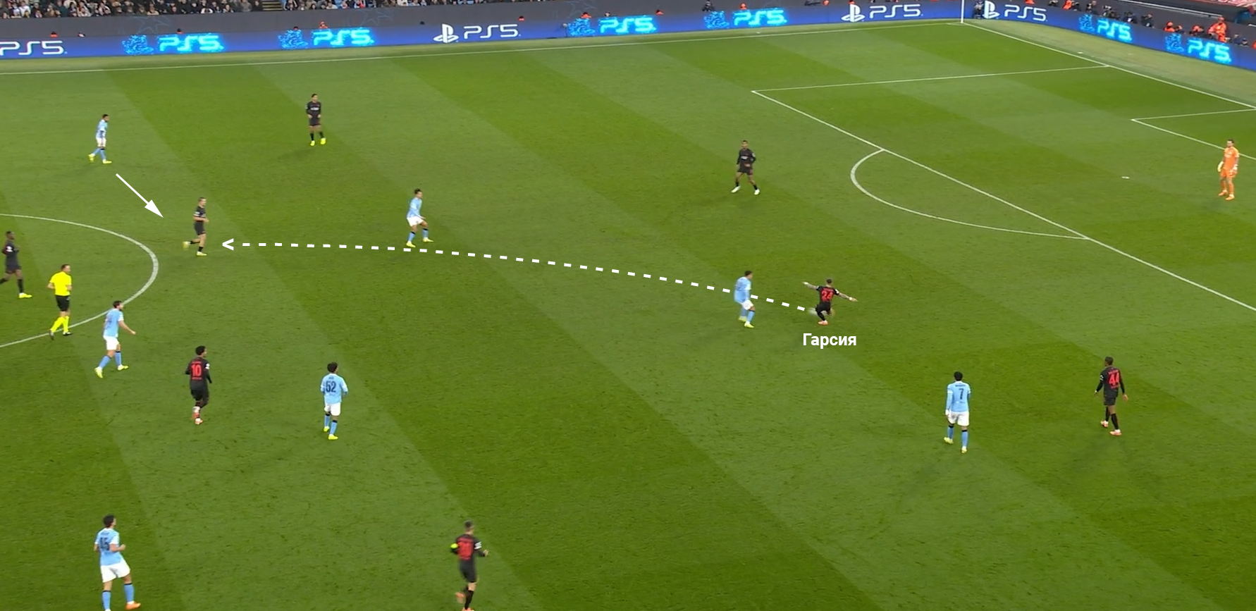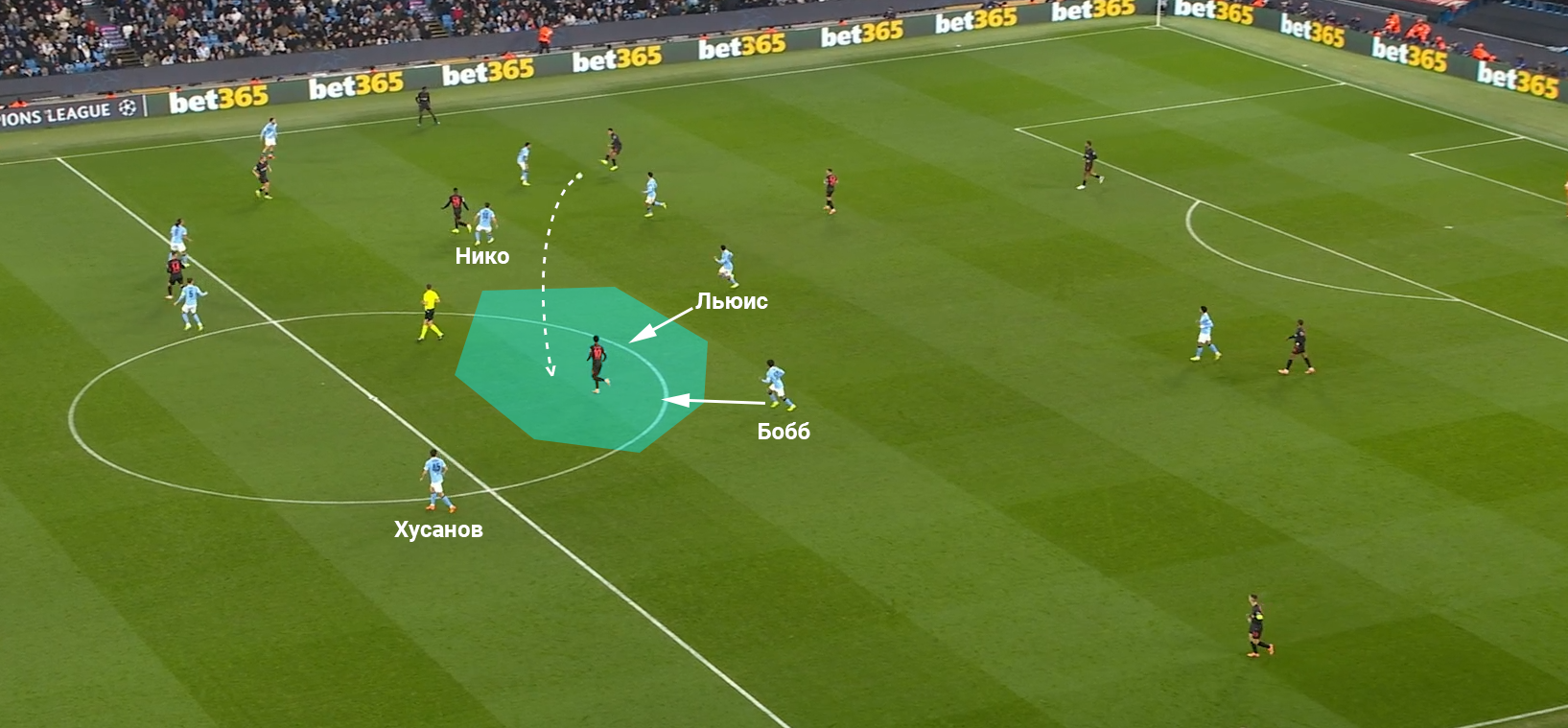 Далее в эту зону под Рико мог приходить Гримальдо, Тильман, да кто угодно. С другого фланга вингеры Сити всё равно не заужали и давали разгонять атаки оппонентам: