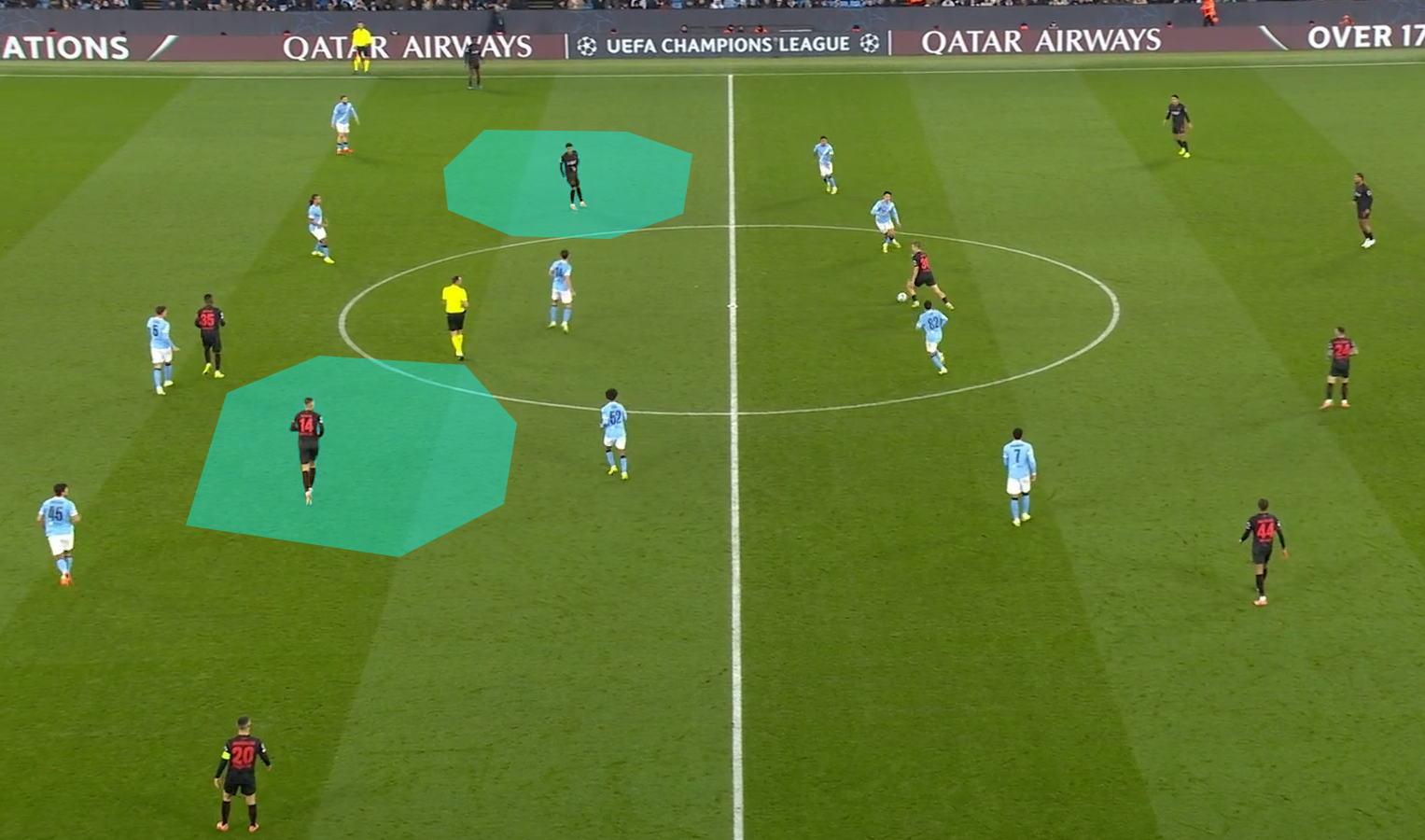 Как раз после выдёргивания одного из опорных Сити, игроки Байера находили свободного игрока в опорной зоне: