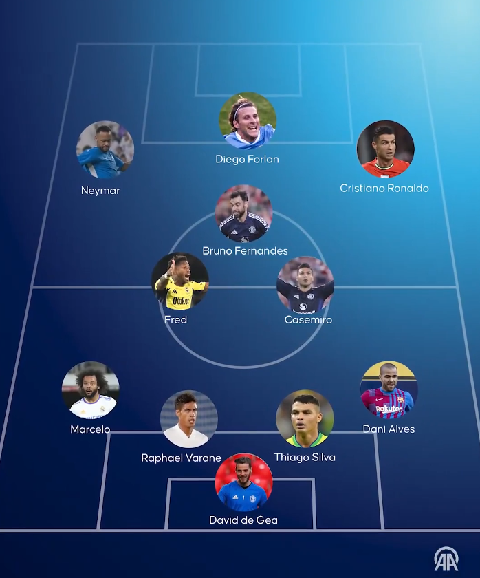 Давид Де Хеа; Дани Алвес, Тиаго Силва, Рафаэль Варан, Марсело; Фред, Каземиро; Бруну Фернандеш; Неймар, Криштиану Роналду, Диего Форлан.