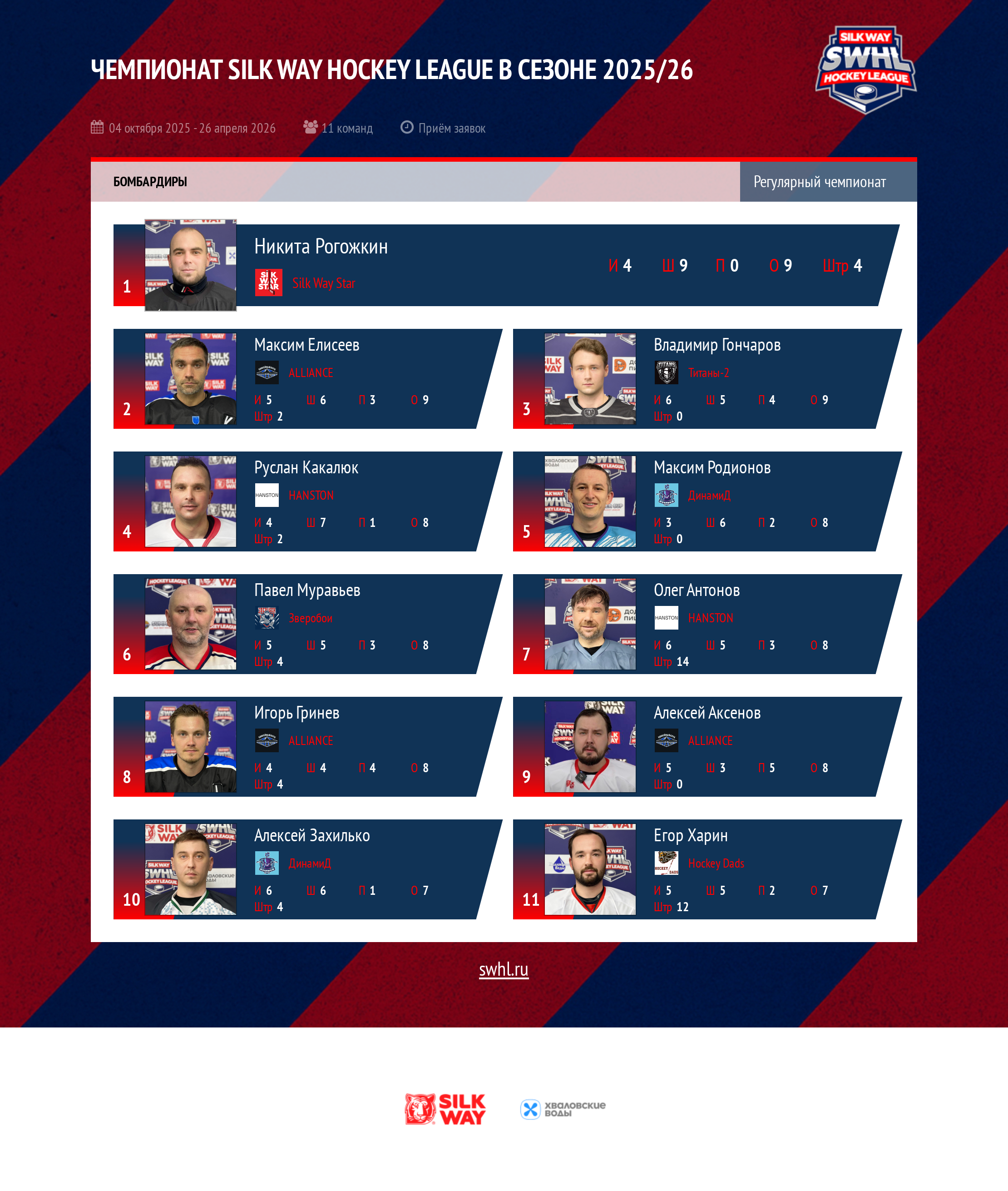 ТОП-11 БОМБАРДИРОВ SWHL ПОСЛЕ ШЕСТОГО ТУРА