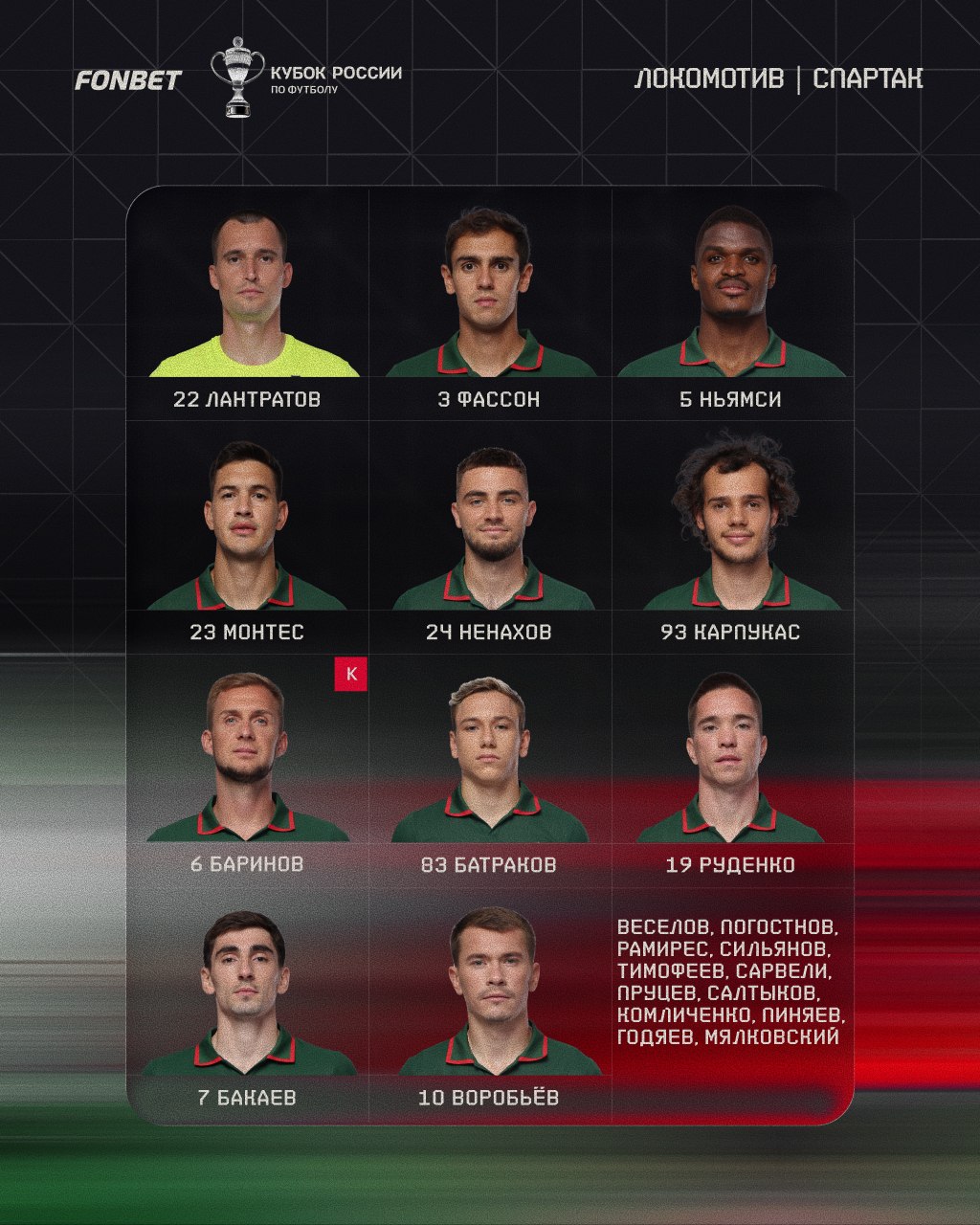 ⚡️Стартовый состав «Спартака» на FONBET Кубок России (Путь РПЛ 2-й матч) сезона 2025/2026 в дерби против «Локомотива»