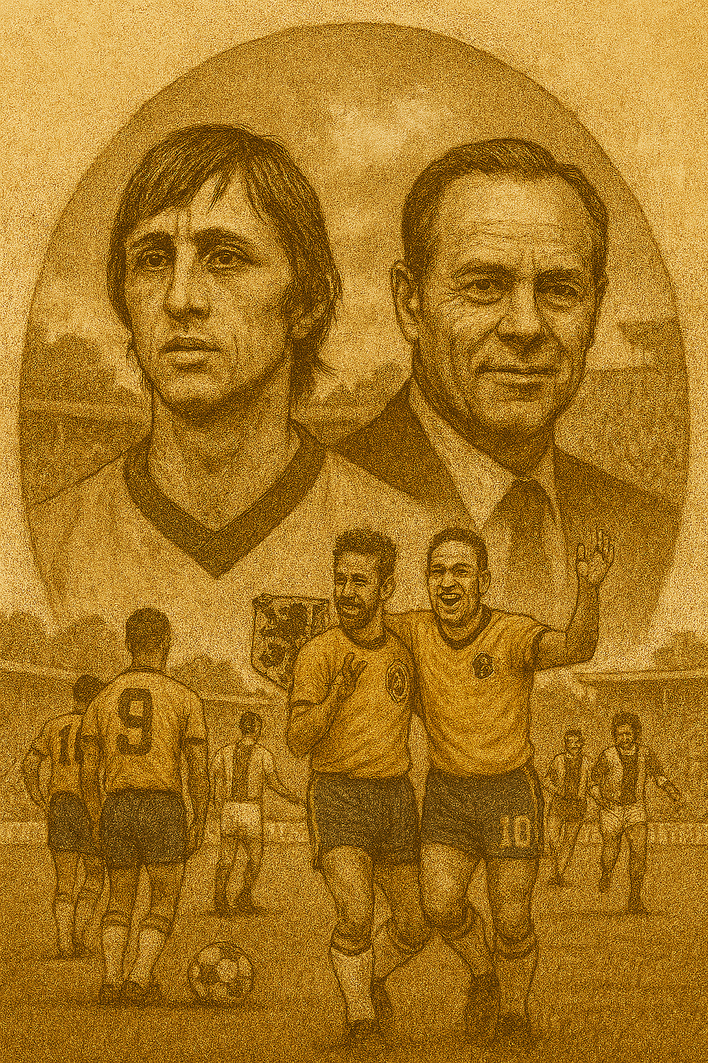 Тотальный футбол не родился в тишине архивов и не возник как мгновенная мода — он вырос из улиц, академий и строгих тренировок, из потребности сделать игру не просто эффективной, а осмысленной. В середине 20 века, когда мир футбола искал новые формы, два имени стали точкой отсчёта: Ринус Михелс и Йохан Кройф. Первый дал идее архитектуру, второму досталась роль её живого воплощения; вместе они превратили тактику в философию, а философию — в культурный код, который продолжает жить и эволюционировать.
