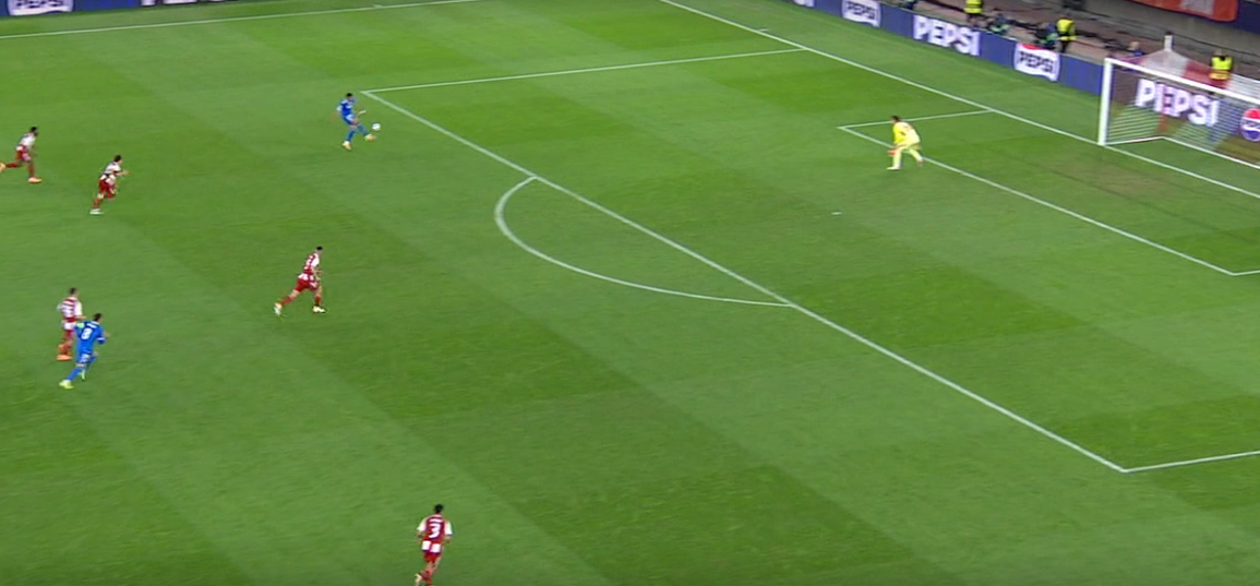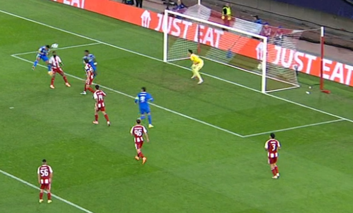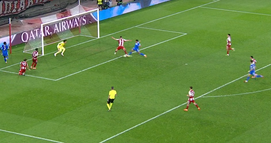 На 29-й минуте защитники «Олимпиакоса» совсем растерялись: бросили Мбаппе, диагональ на него вырезал Эдуардо Камавинга. Как же так оставили одного?