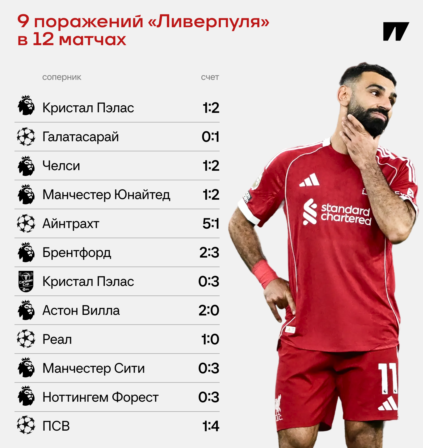 ● Десятки лет с «Ливерпулем» не было такого. Например, три и больше в трех матчах подряд не пропускали с 1992-го. А чтобы проиграть девять раз на таком коротком отрезке – аж с 1954-го!