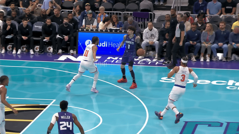 Ламело руководил атакой и заметил забегающего под кольцо одноклубника. Звезда «Хорнетс» не брал мяч в руки, он перевел с правой на левую за спиной и попытался отдать одной рукой не глядя в стиле Йокича. Но снаряд прилетел в лицо Брансона с близкого расстояния.