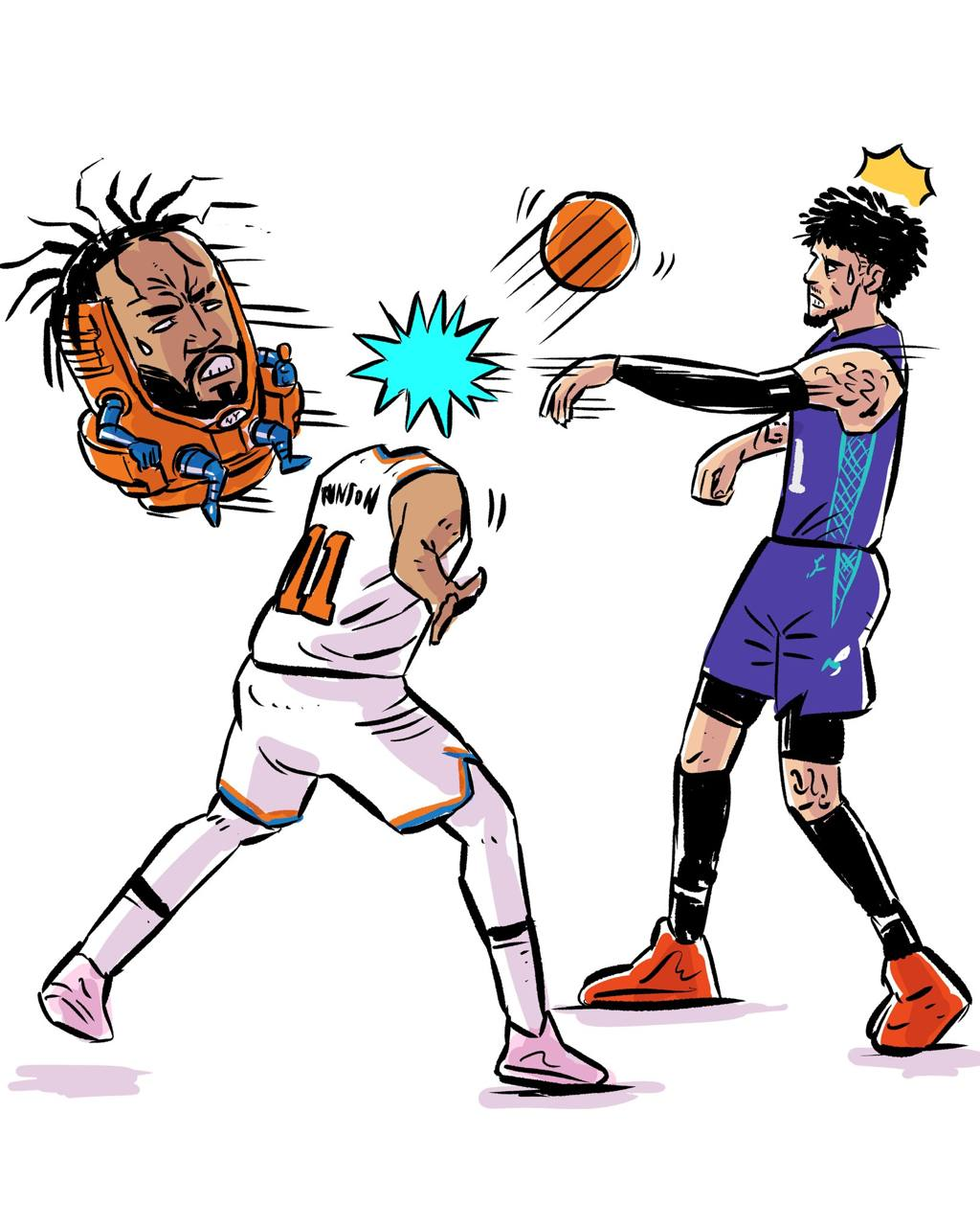 Художник Джей Ким, известный своими зарисовками на тему НБА, тут же выкатил очередную работу: как Ламело снес голову визави.