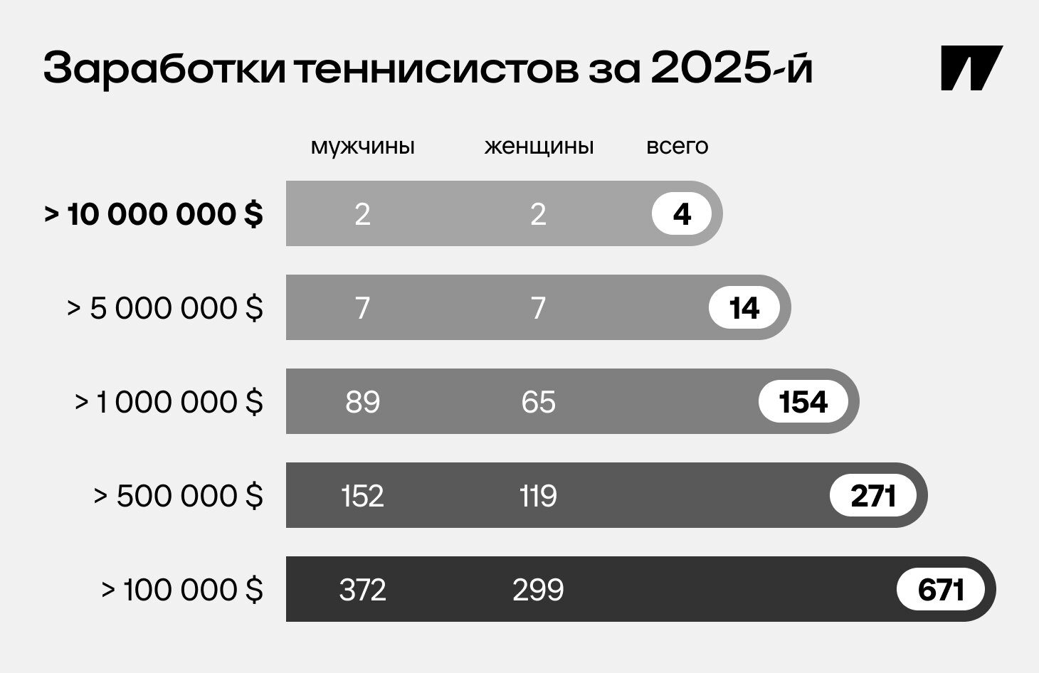 ● Сезон-2025 в целом серьезно повлиял на исторические рейтинги. Алькарас (22 года) и Синнер (24) вошли в топ-10 самых успешных теннисистов в истории, а Соболенко теперь вторая по заработкам среди женщин и десятая – в истории.