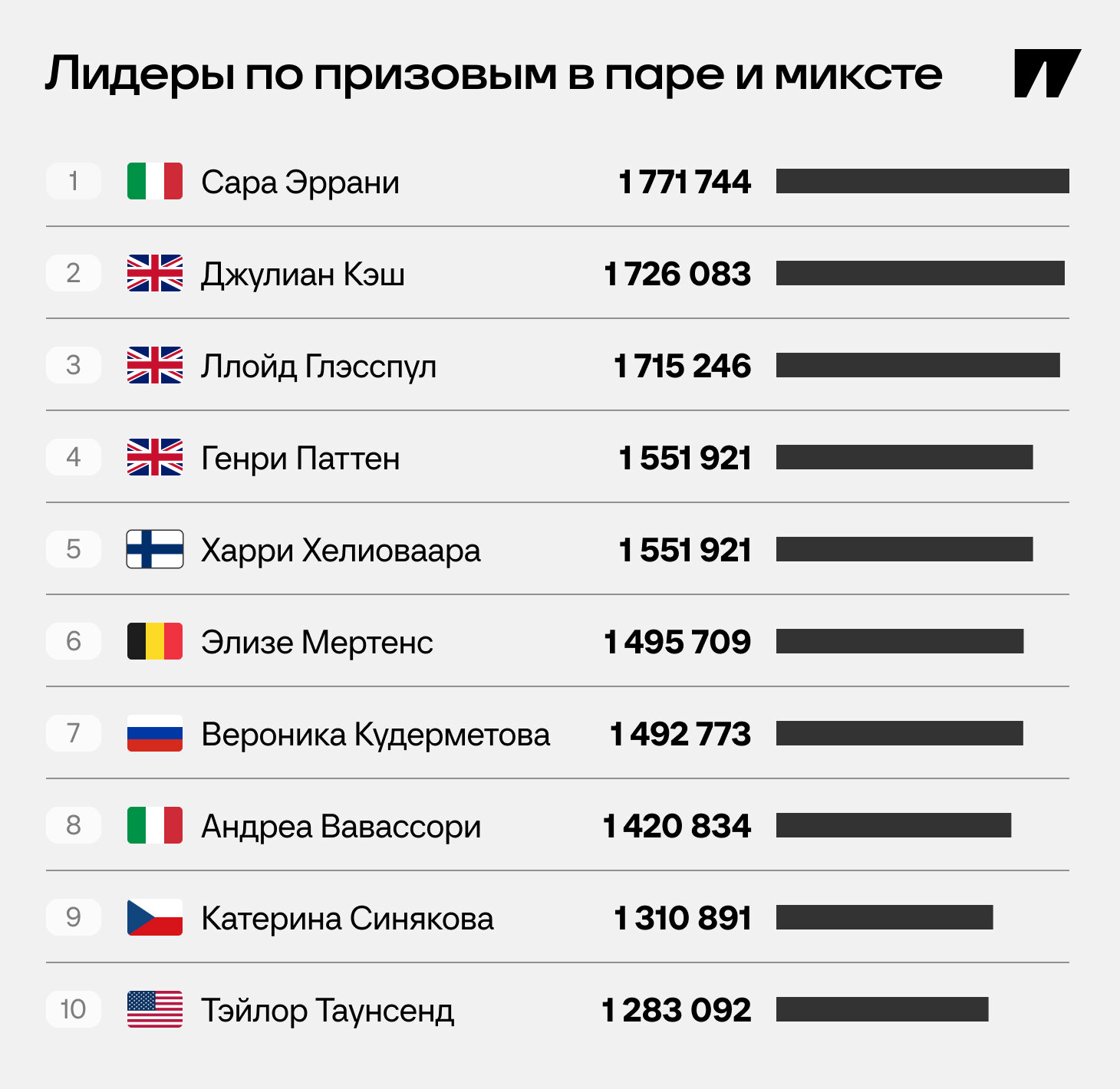● Поэтому мы посмотрели, кто больше всего заработал чисто парой и микстом. Лидером стала завершившая одиночную карьеру Сара Эррани. Причем почти треть ее призовых – это 500 тысяч долларов за победу в турнире микстов на US Open. Который она нещадно критиковала.