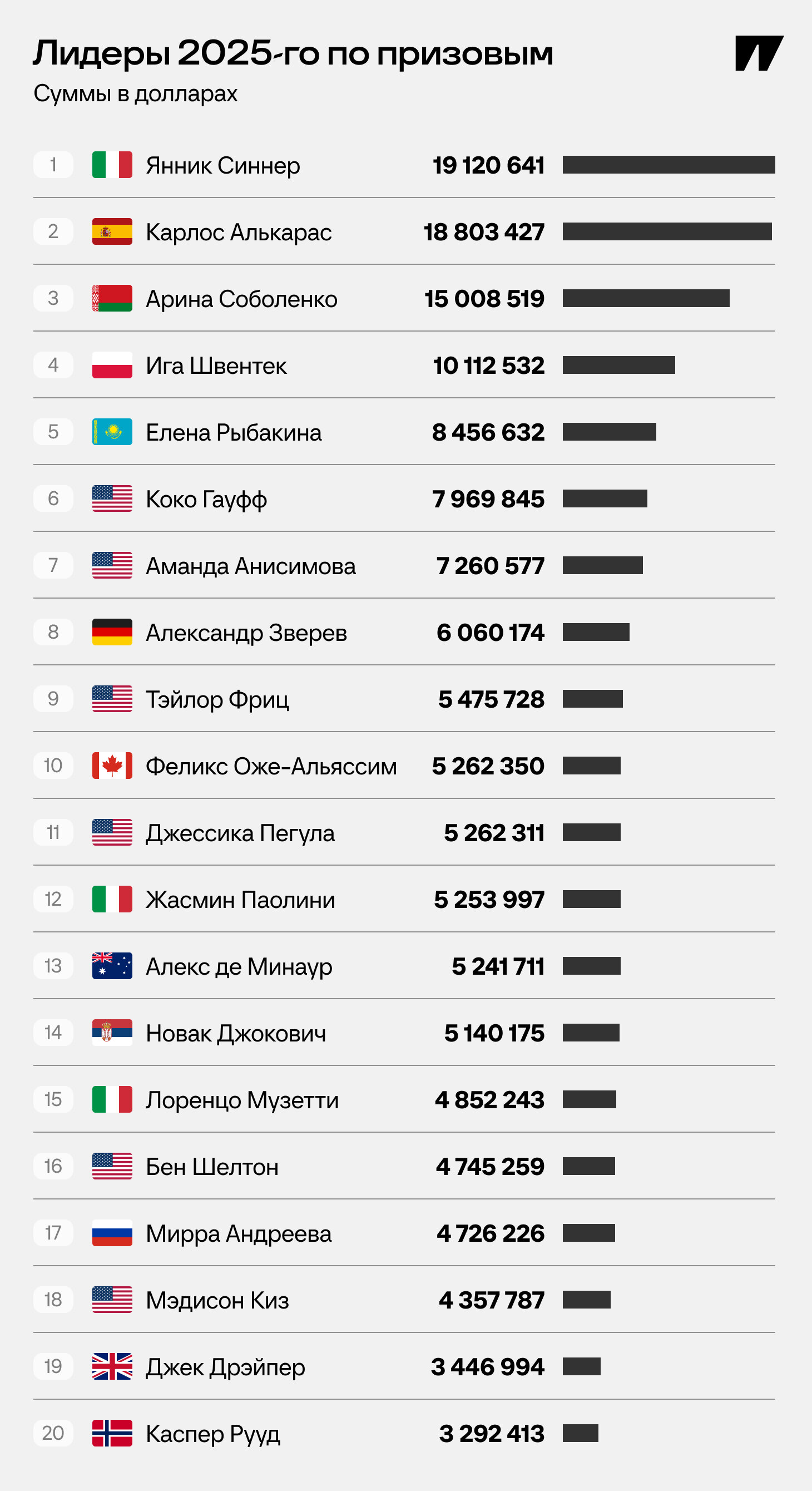 ● При этом нужно понимать, что в призовых Синнера не учитываются 6 млн долларов, которые он выиграл на выставочном турнире в Саудовской Аравии. Если добавить их, то он первый теннисист в истории, заработавший на корте больше 25 млн.