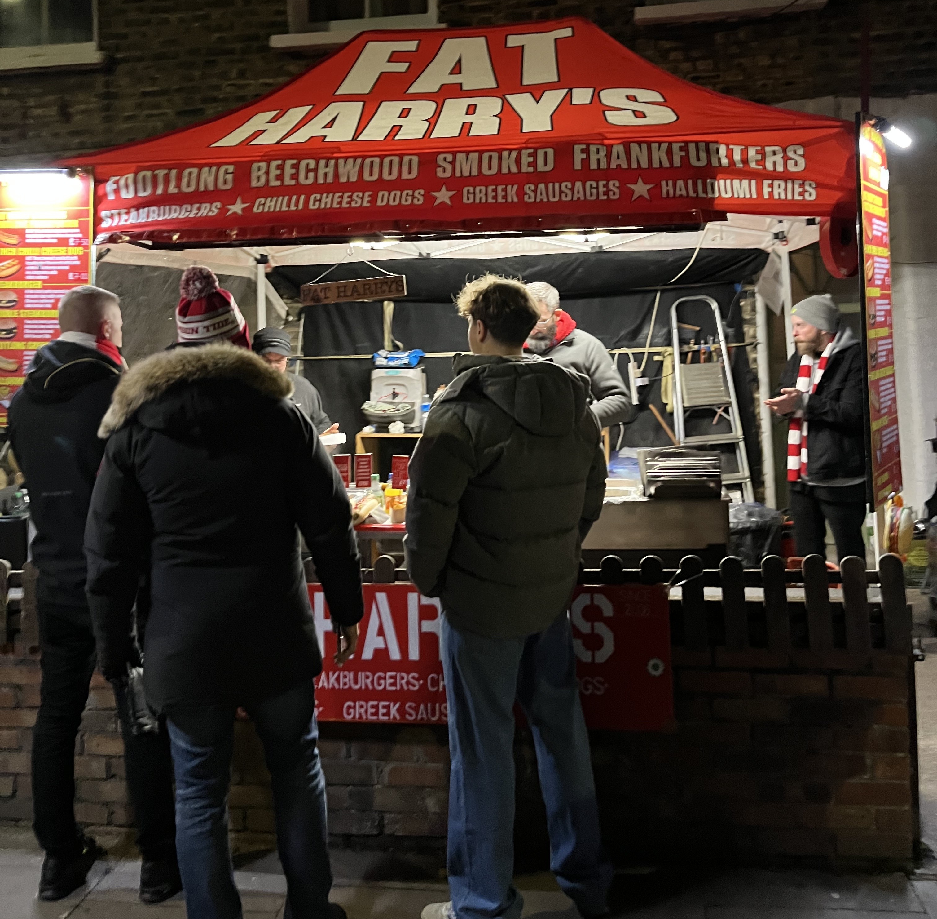 Быть активным поклонником «Арсенала» в Лондоне – удовольствие не из дешевых. Чтобы сэкономить хоть где-то, болельщики едят дома у многочисленных точек вокруг стадиона – в два раза дешевле чем на «Эмирейтс». В среду я не смог пройти мимо вывески «У жирного Харри». Кажется, раньше этой точки не было – неужели переименовали перед «Баварией» в насмешку над Кейном? Как известно, Харри отчислили из «Арсенала» в детстве за лишний вес.