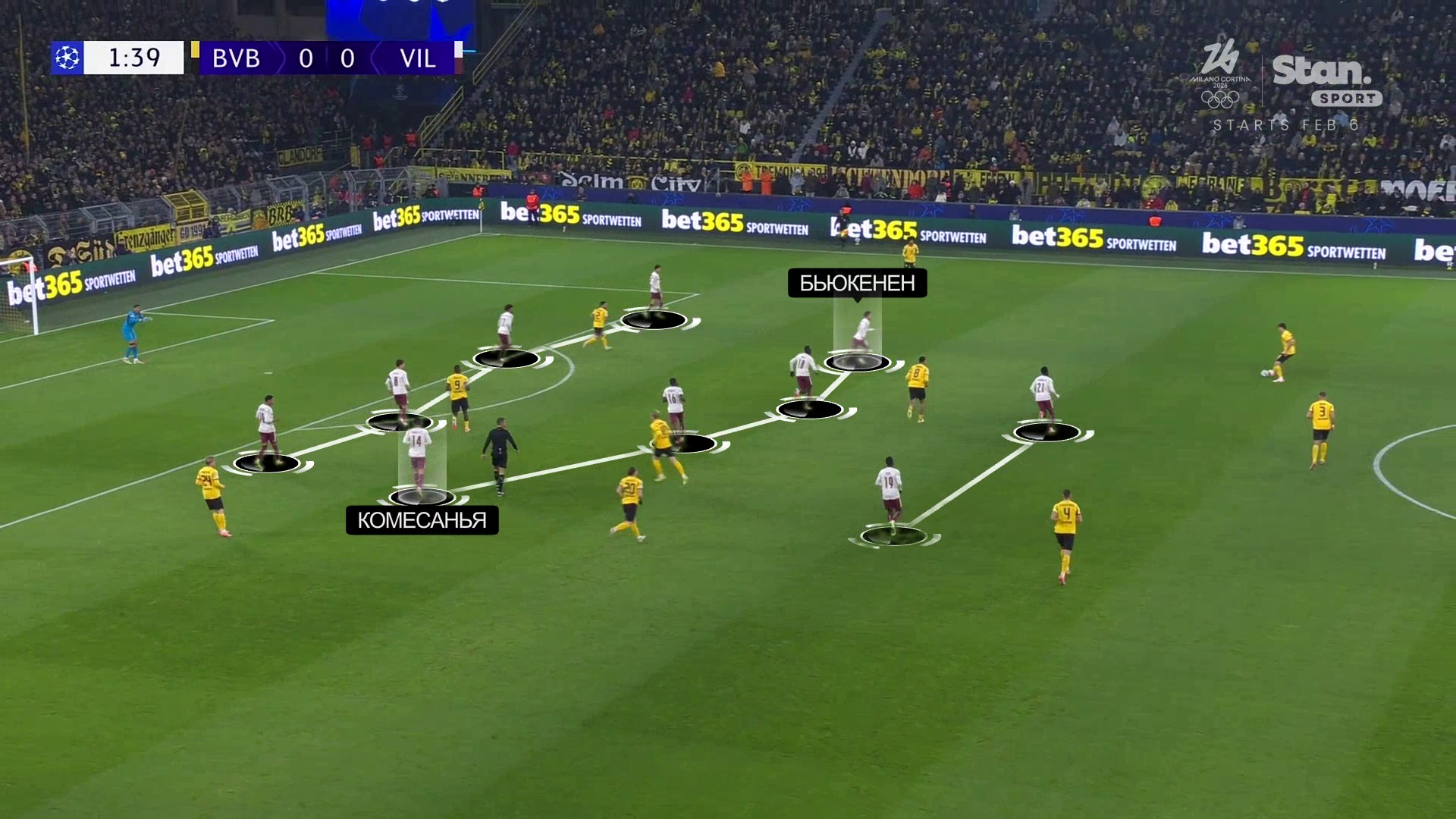 В Ла Лиге «Вильярреал» играет в ярком стиле, но на эту встречу пришел с автобусом, который должен был вскрыть слабости «Боруссии» в позиционной атаке. В рамках традиционной 4-4-2 на флангах вышли Санти Комесанья (опорник) и Таджон Бьюкенен (латераль). Более креативные Альберто Молейро и Жерар Морено в состав не поместились: