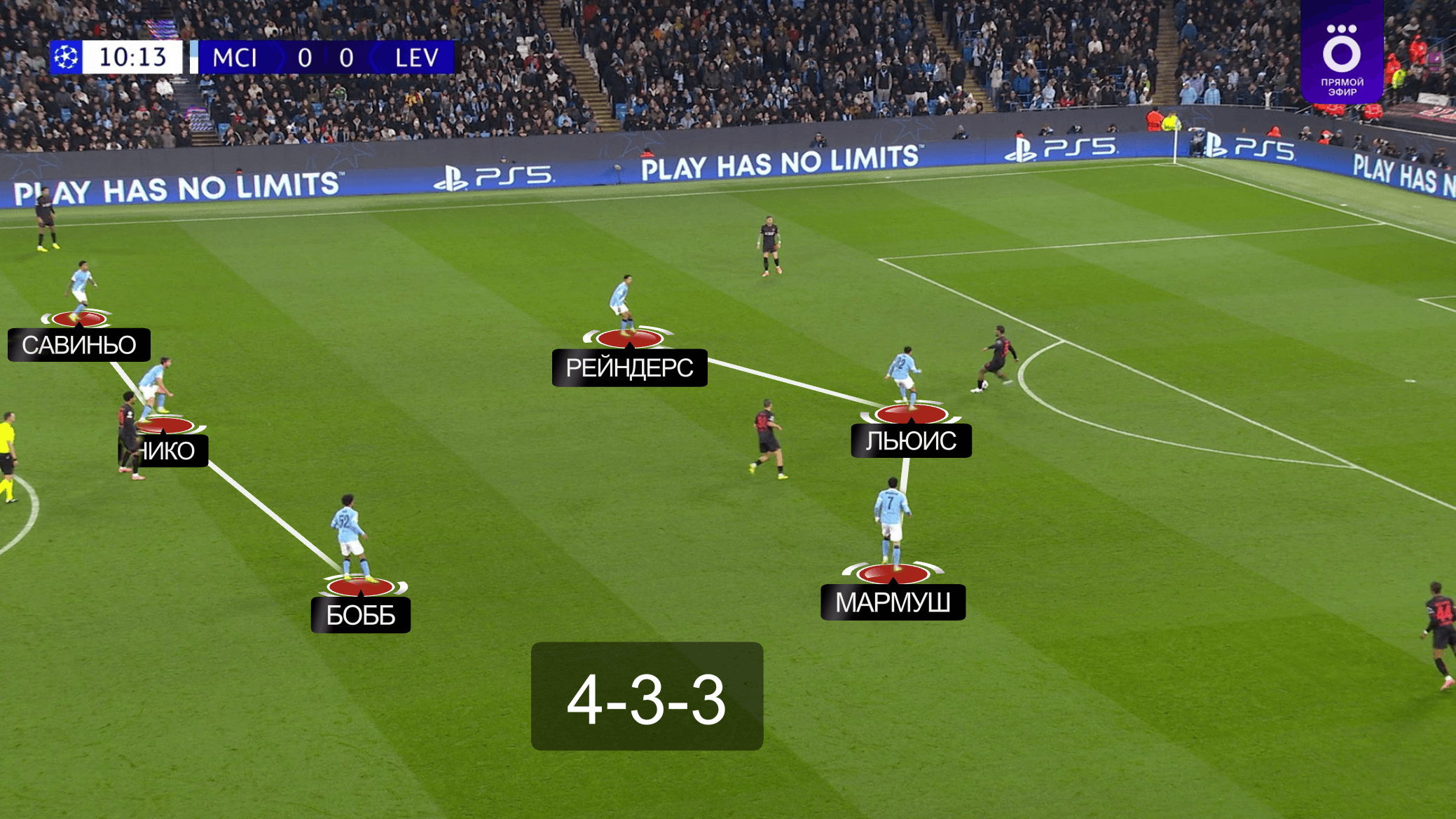Еще одна подстава от Пепа – тактическая. Команда выбрала необычную схему давления на матч. Знакомые по сезону 4-3-3, но с атакующей тройкой из нападающего Мармуша и пары восьмерок Рейндерс-Льюис. В следующей линии – опорник Нико + пара вингеров Савиньо-Бобб.
