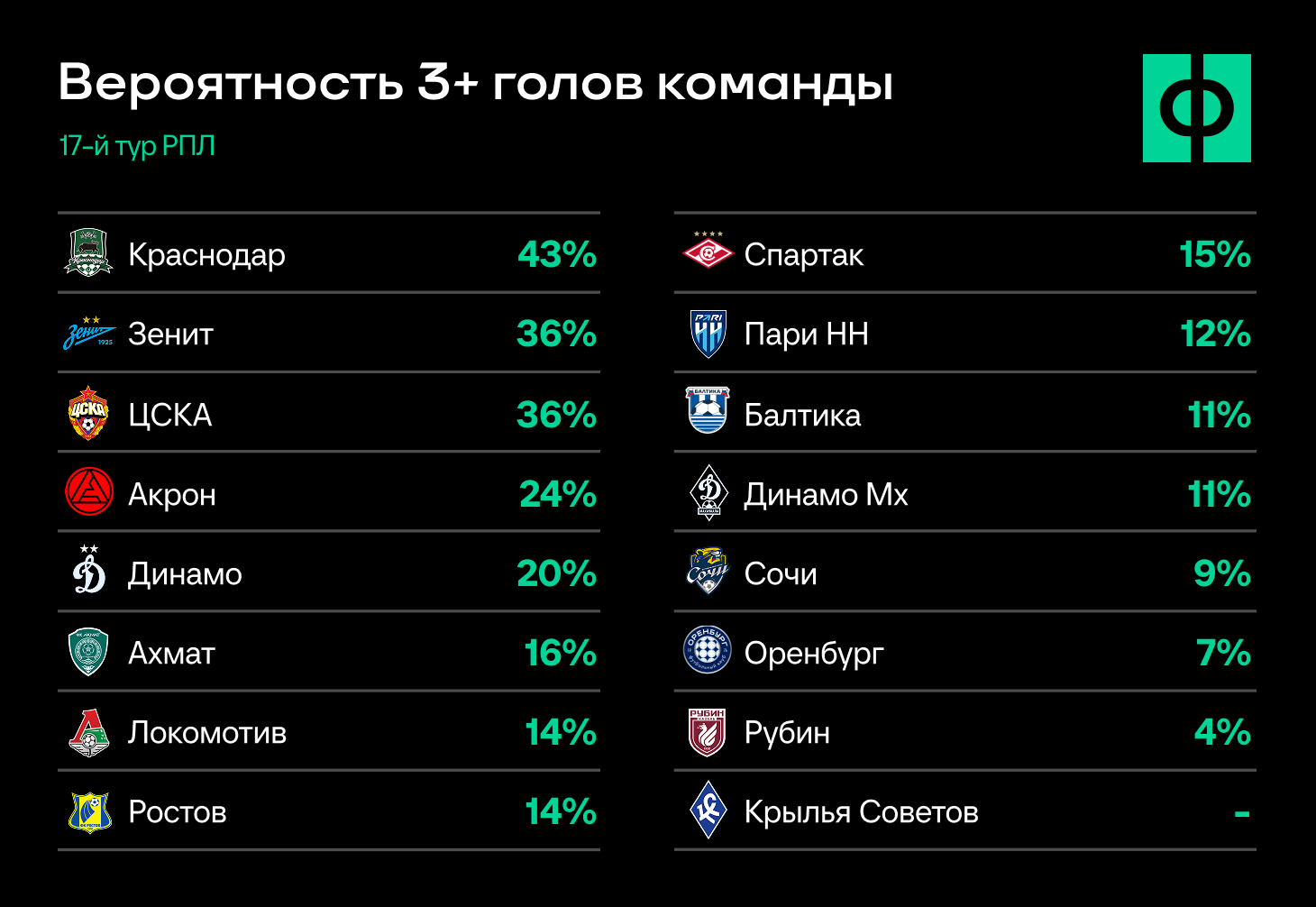 Любопытное сравнение «Зенита» и «Краснодара» в 17-м туре: аналитики ждут, что чемпион забьет «Крыльям» больше, чем петербуржцы – «Рубину». Еще один претендент на разгромную победу – ЦСКА.