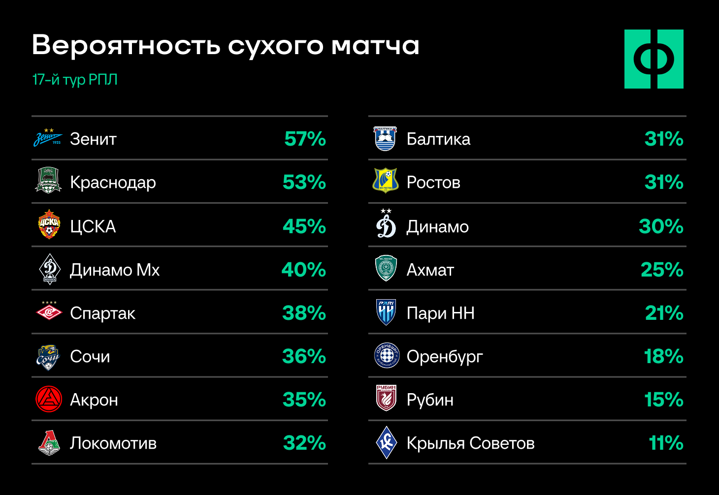 17-й тур – очень перспективный в контексте Фэнтези РПЛ. Как раз при таком расписании логично прогнозировать сразу несколько разгромов. Традиционно смотрим на вероятности букмекеров: у кого больше шансов на сухари и крупные победы?