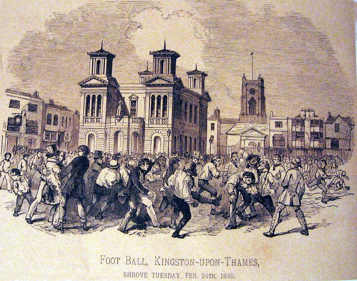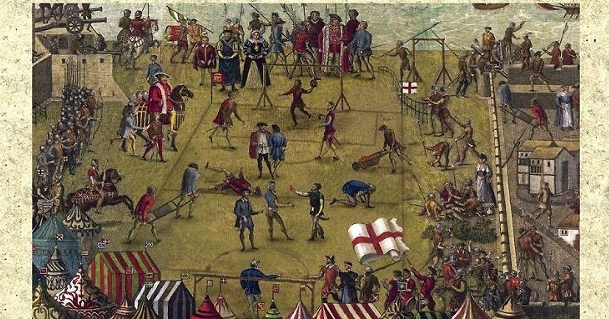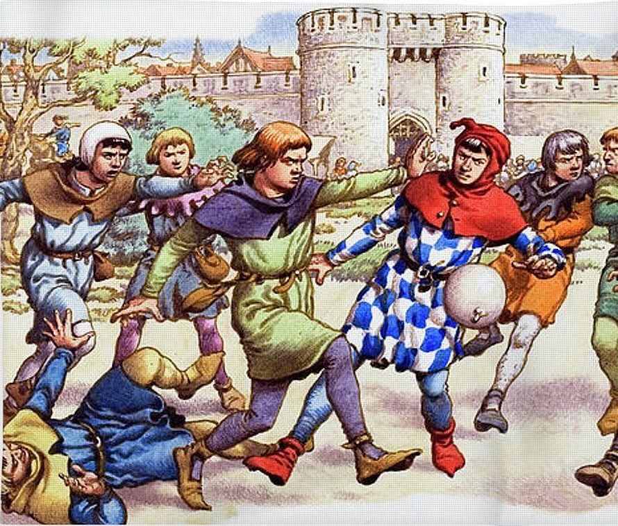 В Средневековье, когда существовала только пародия современного футбола, он представлял из себя довольно странное зрелище. Два, а то бывало и три-четыре десятка мужчин носились друг за другом по полю без схем 4-4-2, разделения на защитников, нападающих и прочие позиции, и пытались забить мяч за линию соперника, а не в ворота. не придумали еще к тому времени ворота. Причем мяч пинали не только ногами и головой, но также периодически хватали его руками. Кстати, именно поэтому гораздо позже уже более-менее современный футбол в Англии стали называть игрой аристократов. Потому что не было в нем такой бестолковой беготни огромной толпы друг за другом, а уже были придуманы хотя-бы минимальные правила. А вот то, во что играли в средневековье, больше напоминало современный регби, ну или «флорентийский кальчо». Обязательно поищите в сети о том, что это такое. Вам понравится увиденное.