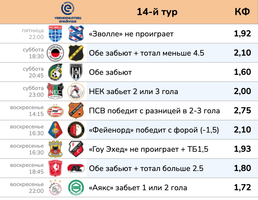 Превью 14-го тура Эредивизи🇳🇱 | Новая звёздочка «Аякса», «Фейенорд» проиграл 4 матча подряд, ПСВ продолжит отрываться