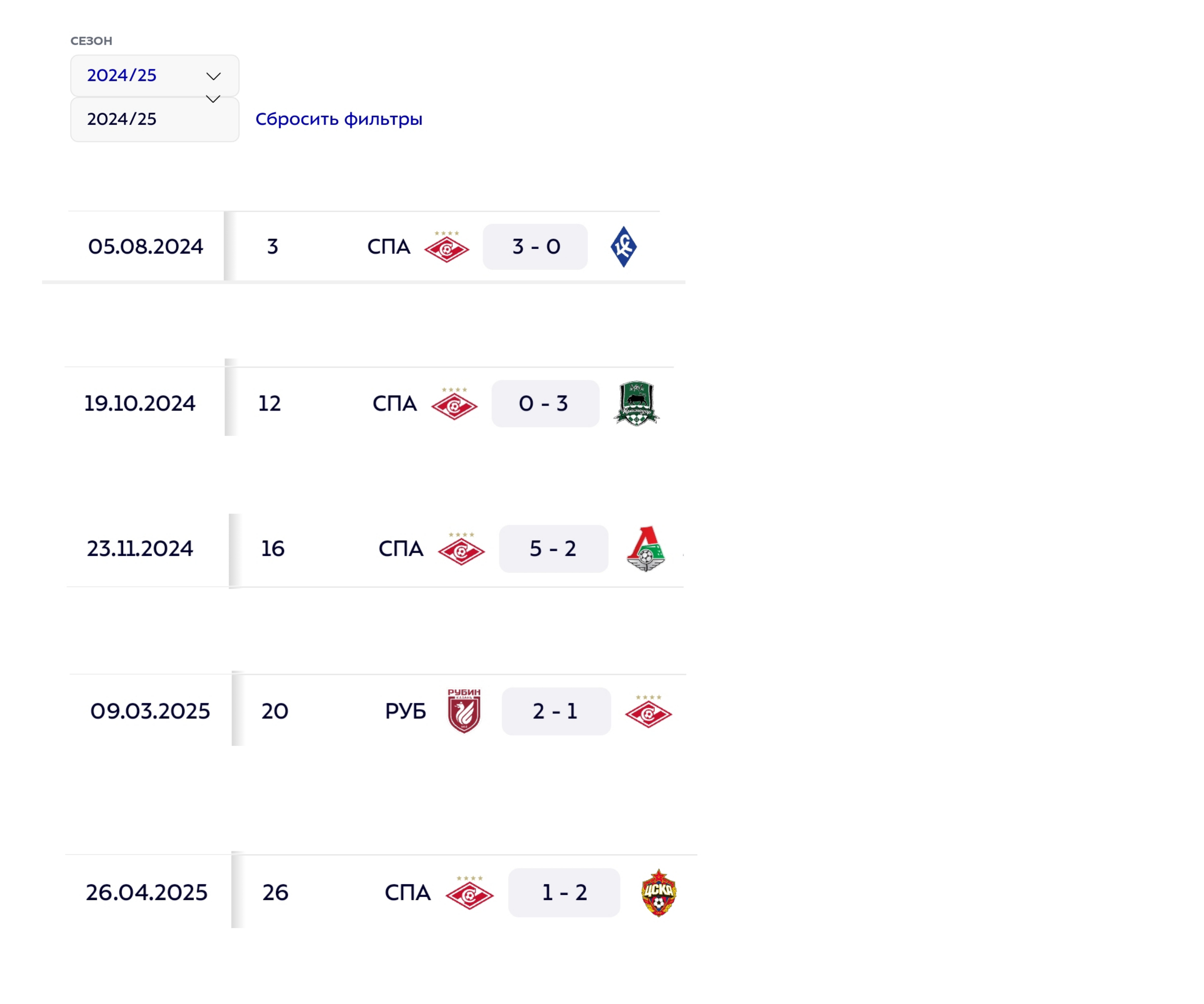 Сезон 2024/25 Именно с этого сезона Кирилл Левников неофициально, куллуарно становится лучшим арбитром РПЛ. Такой взлёт в его карьере для Спартака имеет плохие последствия. Впервые Спартак уходит в отрицательную статистику при его судействе. Три поражения и две победы. Причём поражение от ЦСКА.