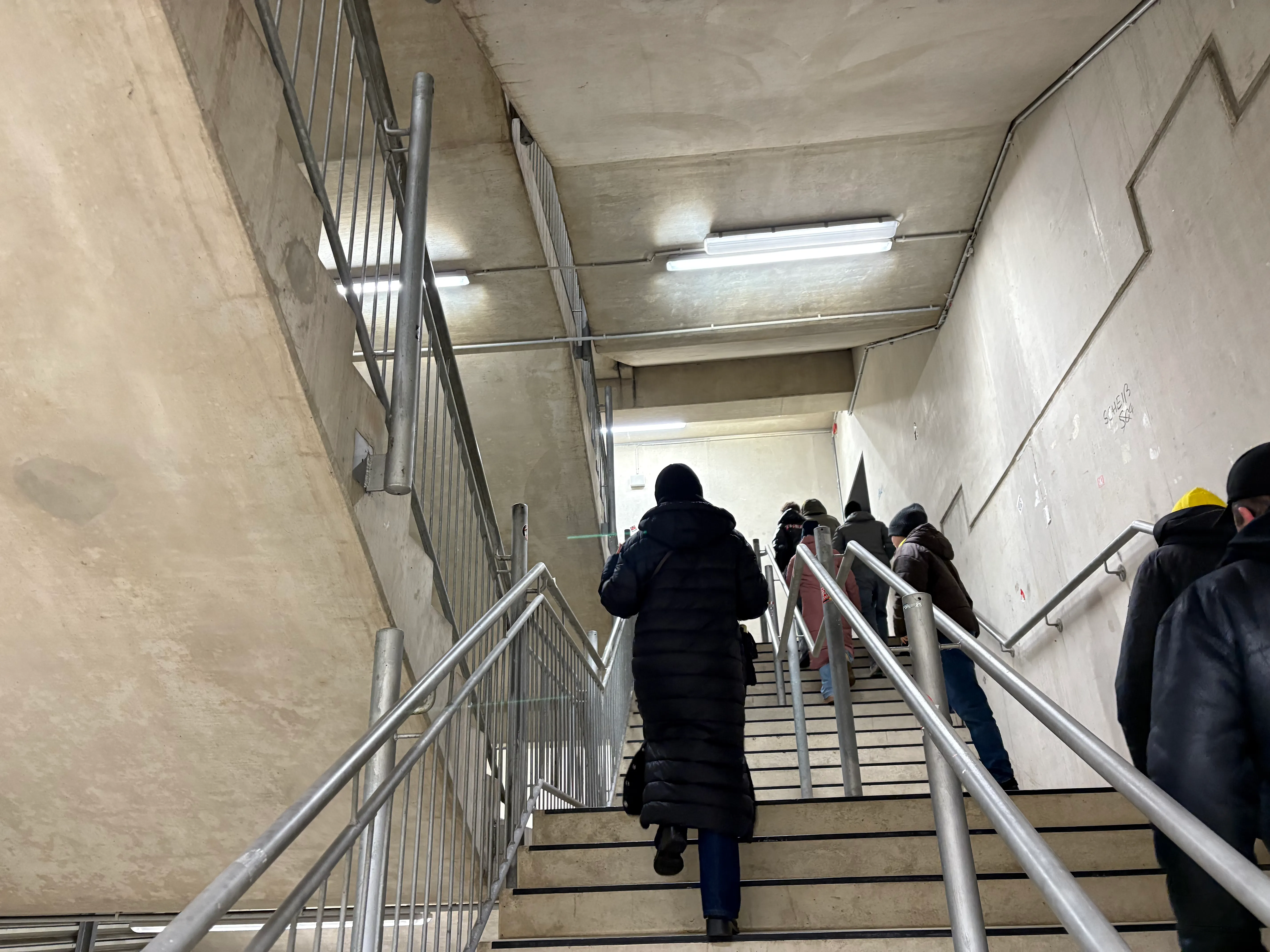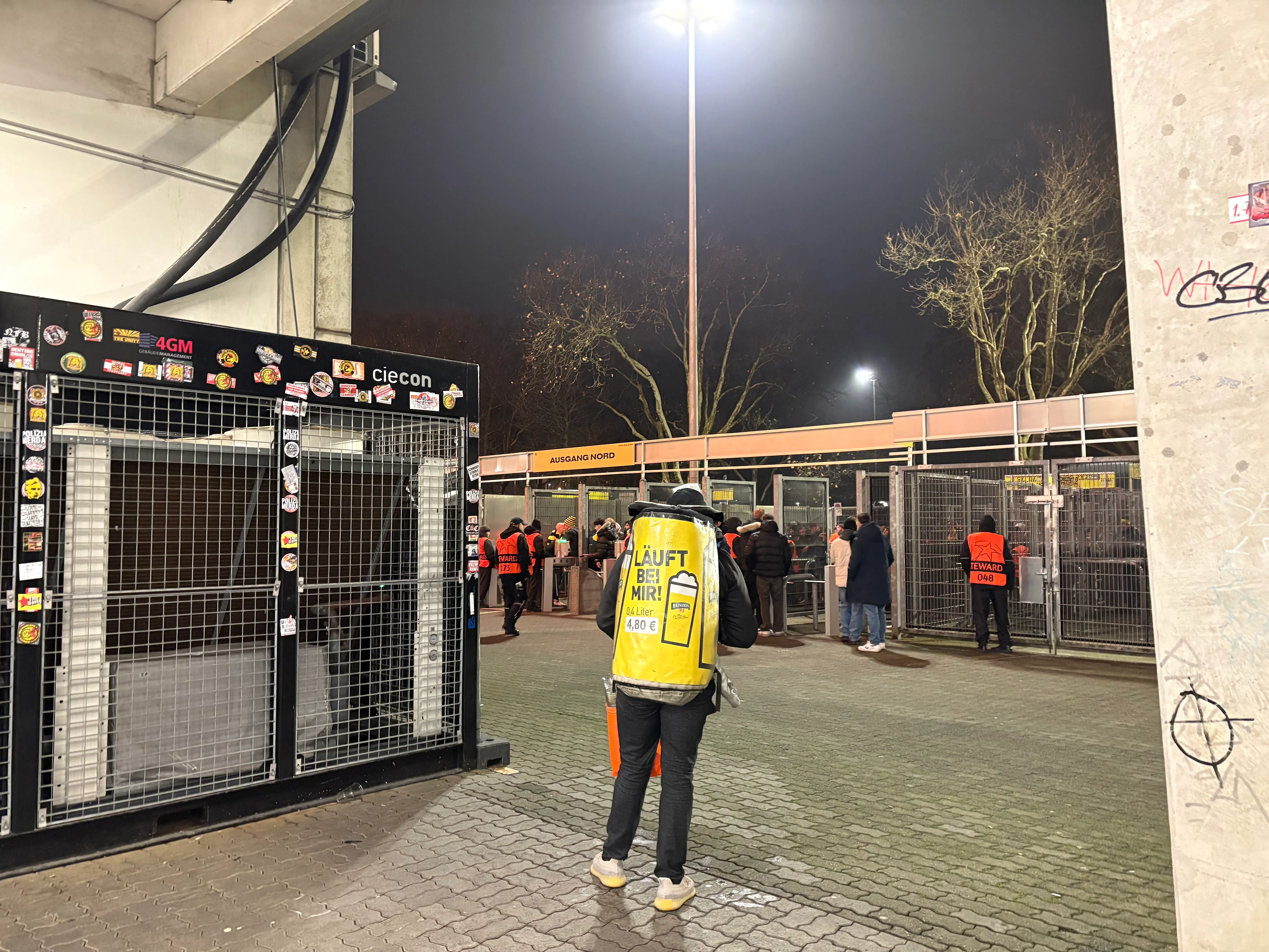 15 минут на подземном трамвае от ЖД вокзала и я оказался непосредственно перед стадионом. Почти сразу же начинаются палатки с едой и напитками. Атмосфера мрачноватая скорее из-за слабого освещения, и стоять в толпе не хочется.