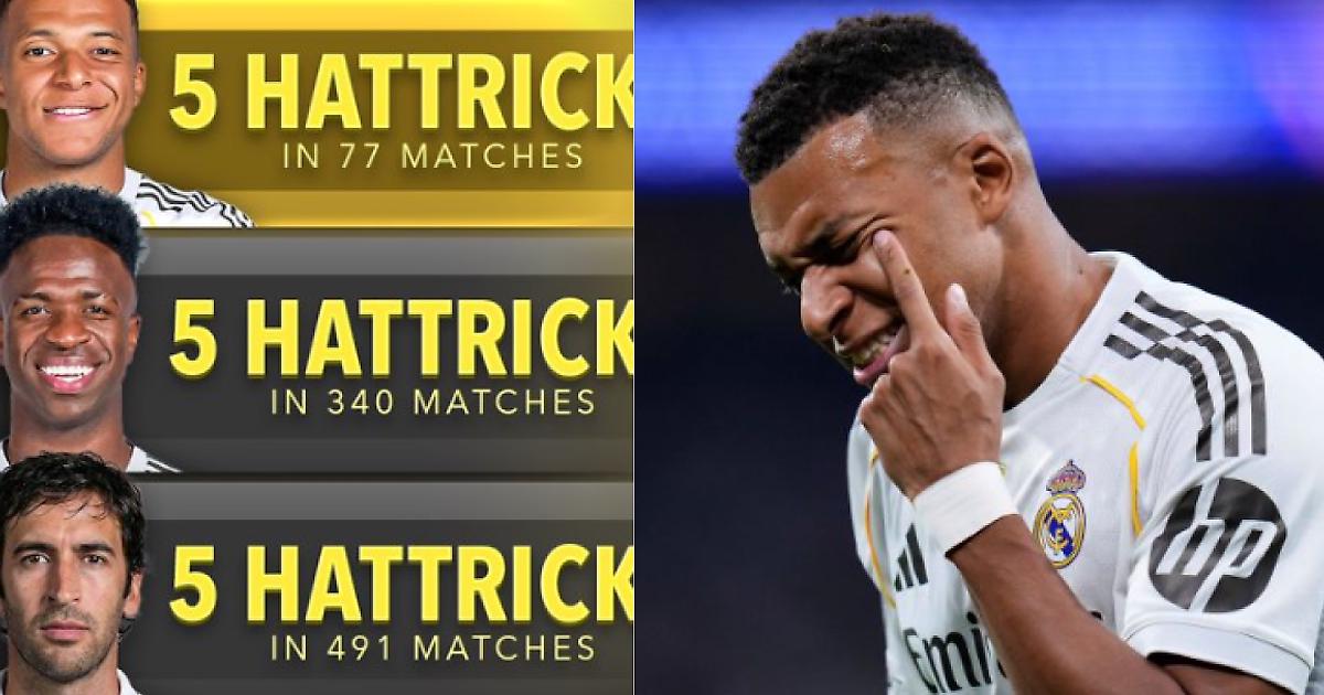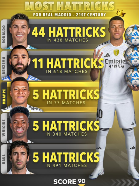 Килиан Мбаппе уже стал третьим по количеству хет-триков в «Реале» в 21 веке — и ему понадобилось всего77 матчей, чтобы догнать Винисиуса и Рауля. У обоих по пять, но они сыграли 340 и 491 матч соответственно.