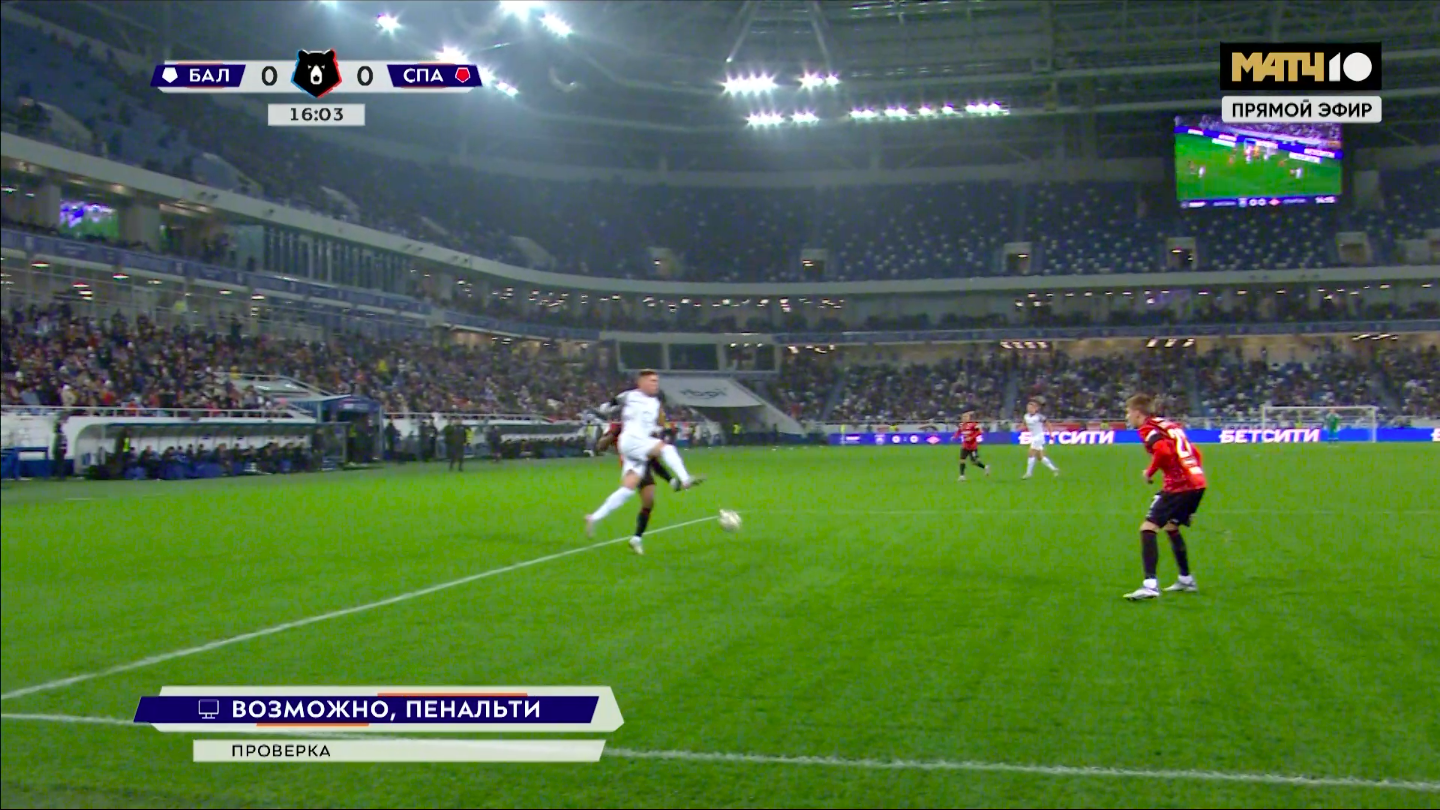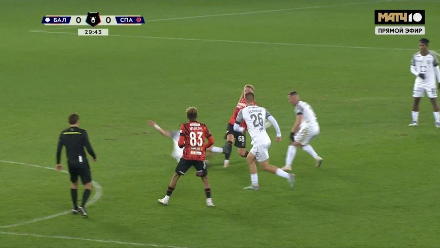 На 15-й минуте «Балтика» рассчитывала на пенальти. Владислав Саусь активно пошел на мяч и упал в штрафной «Спартака» после единоборства с Маркиньосом. ВАР подтвердил решение главного судьи Кирилла Левникова: спартаковец не фолил.