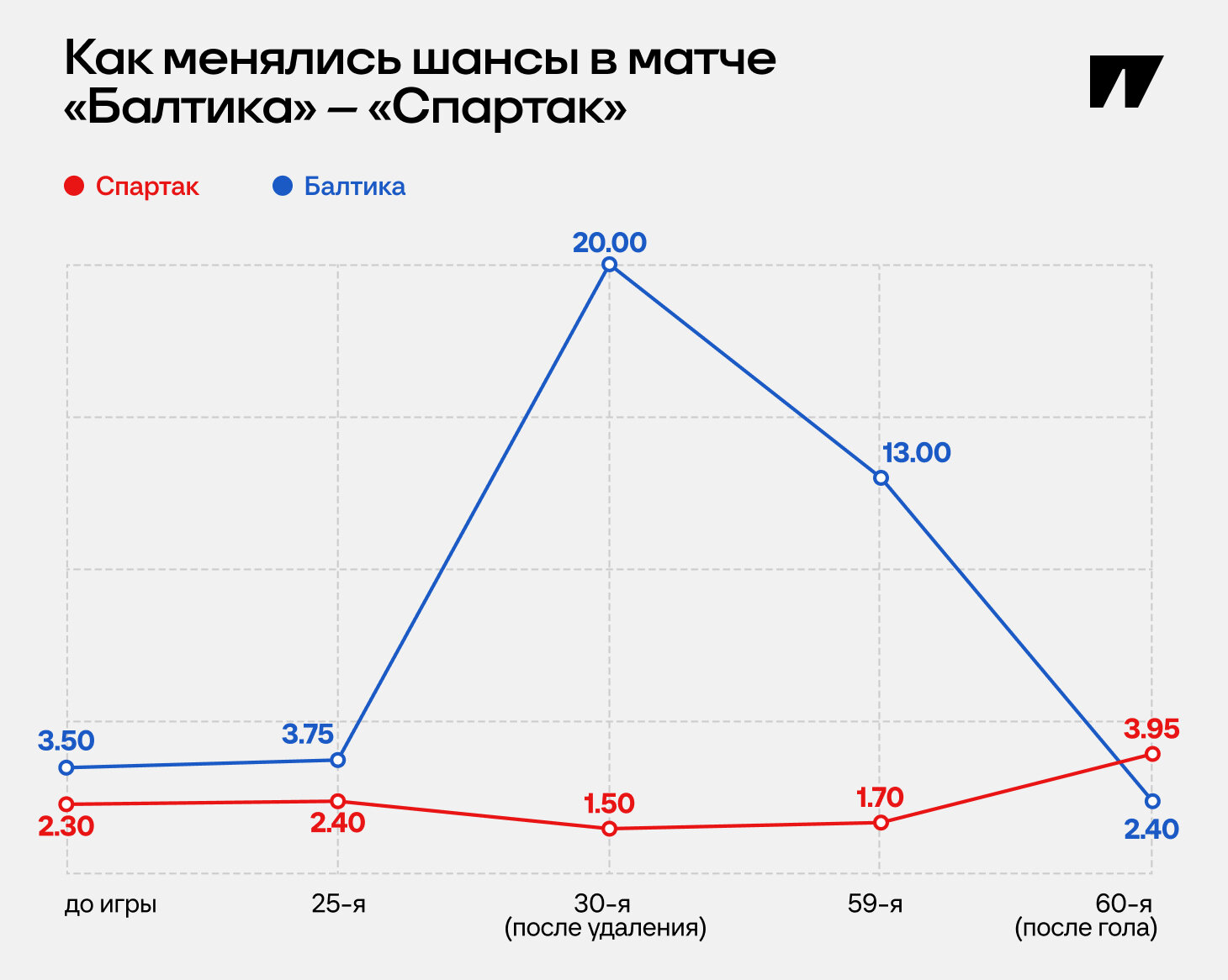 При этом до матча динамика была очевидной: коэффициент на «Балтику» вырастал до 3.50, у гостей было больше 40% на победу. А сценарий только подталкивал к трем очкам «Спартака».