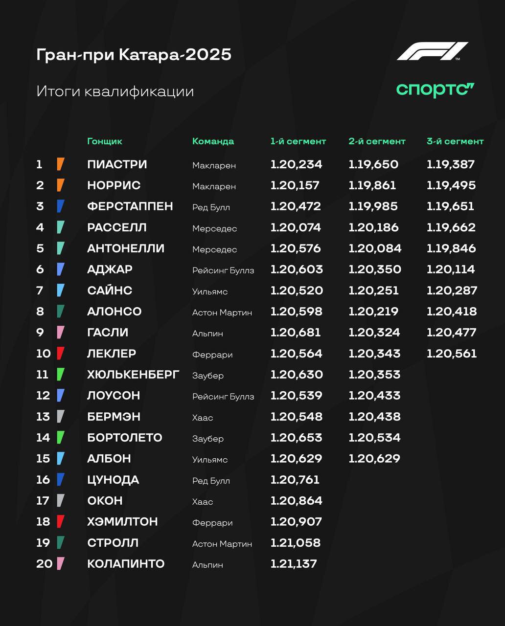 Норрис, возглавлявший протокол в начале заключительного сегмента, в решающей попытке запорол быстрый круг – и остался вторым. А Ферстаппен и «Ред Булл» после сложной пятницы сумели прибавить – Макс разместился на третьем месте. Впрочем, для борьбы с Пиастри болиду RB21 в Катаре не хватает темпа.