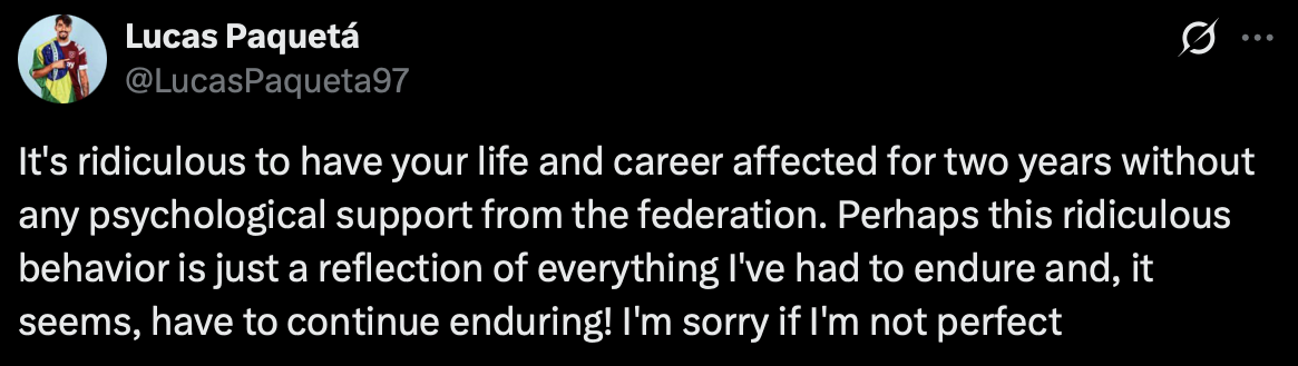 «Смешно, когда твоя жизнь и карьера страдают в течение двух лет без какой-либо психологической поддержки со стороны федерации. Возможно, это нелепое поведение является лишь отражением всего того, что мне пришлось пережить и, похоже, придется продолжать переживать! Простите, если я не идеален».