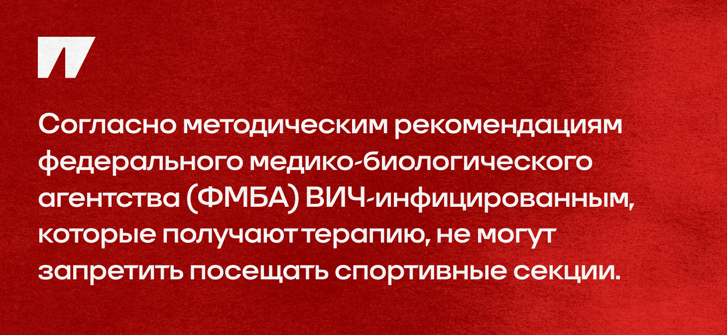 ВИЧ-инфицированным не могут отказать в зачислении на секцию или в спортивный клуб. По закону им даже необязательно говорить о диагнозе