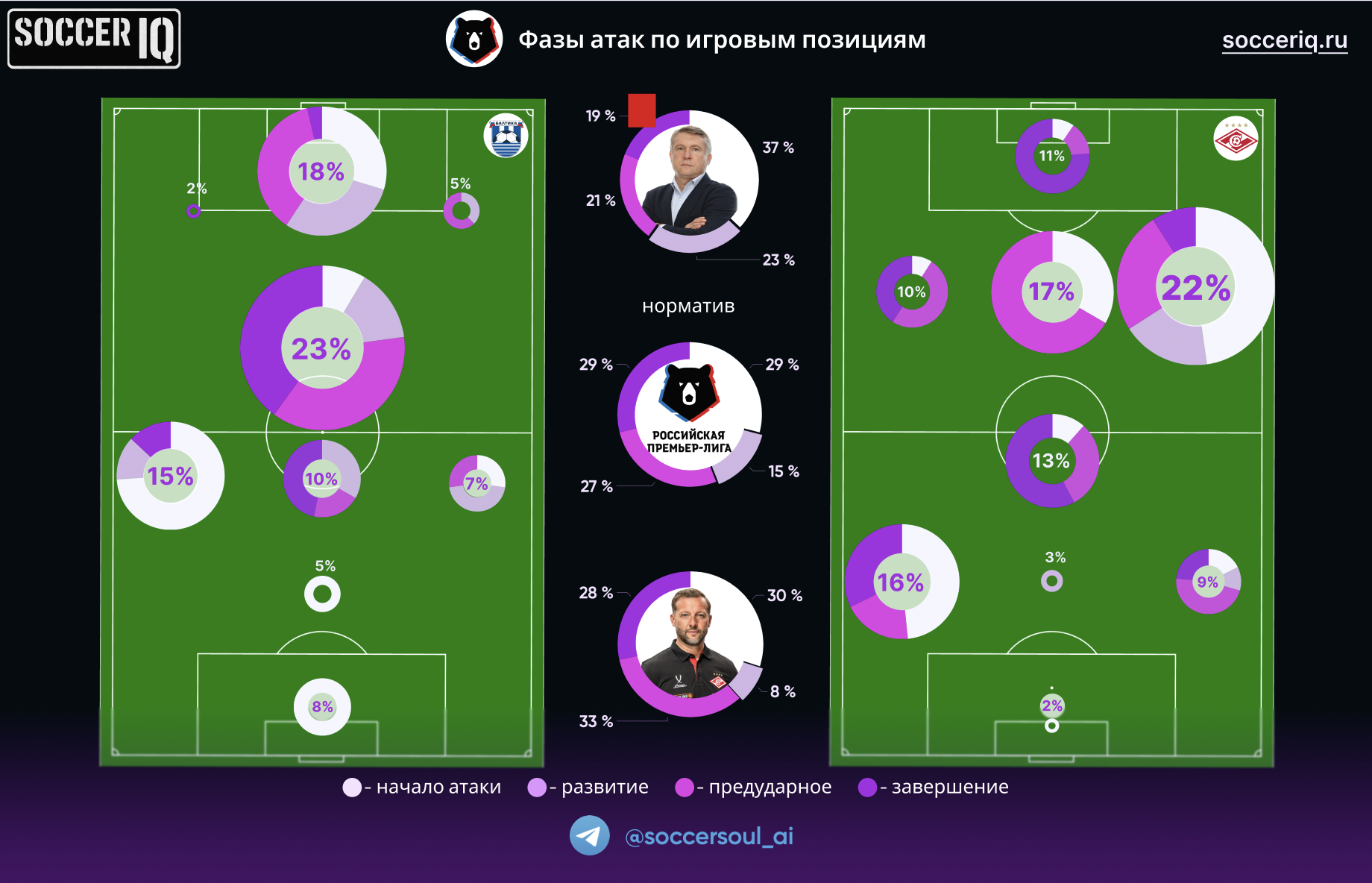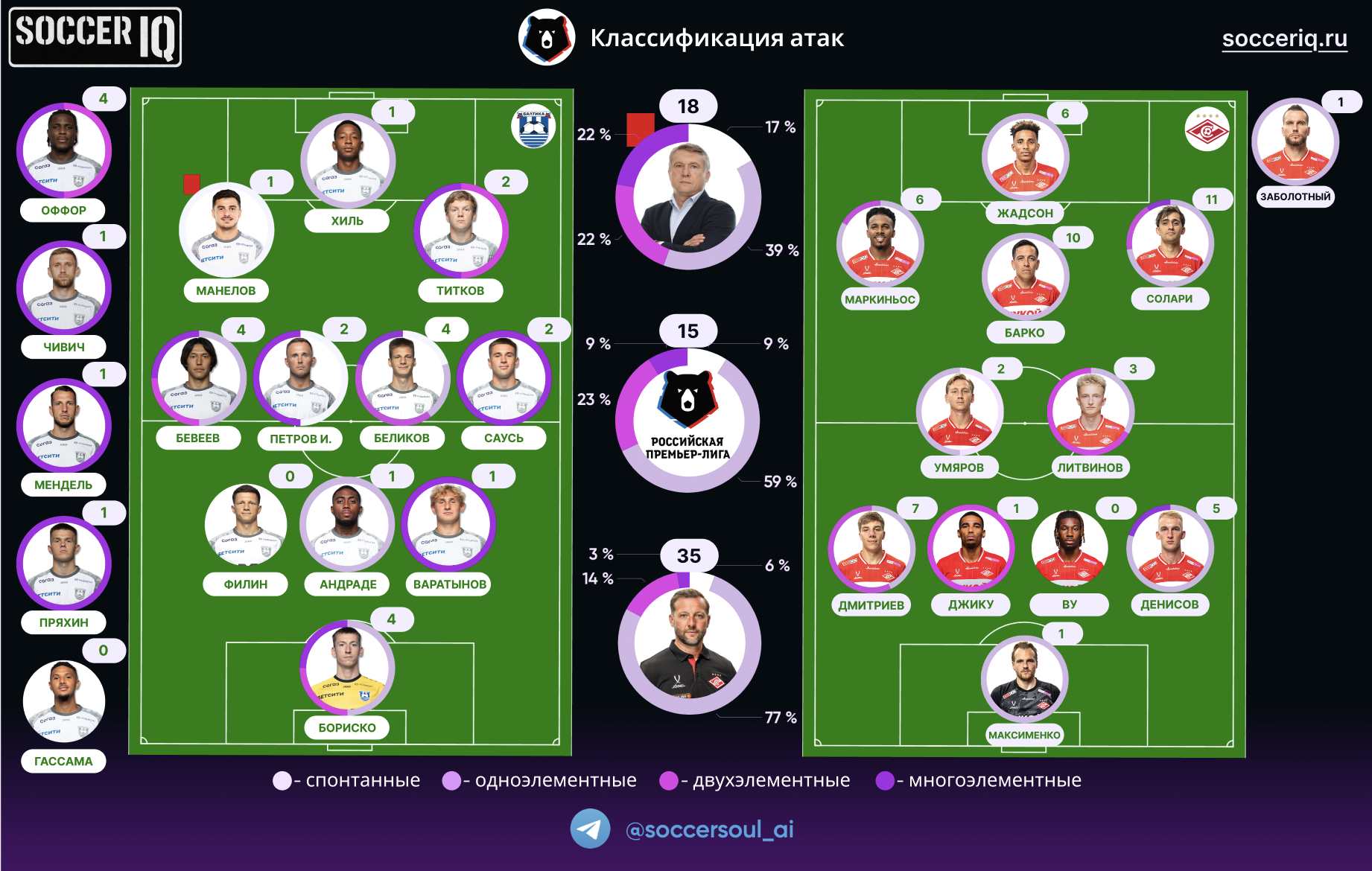 Более того, классификация атак не демонстрирует нам какой-то тренерской работы с имеющимися футболистами. Типология – это про тренеров, но не меньше и про игроков, а классификация – это только про тренеров! С точки зрения типологии Спартак в порядке (было бы странно обратное при общей стоимости состава в 141 млн. евро против 25,5 млн евро у Балтики), а вот с точки зрения классификации, как показывает инфографика – ситуация грустная. Когда у Балтики работа тренерского штаба видна даже без главного тренера на бровке, Спартаку стоит анализировать матчи цифрами, а не эмоциями!