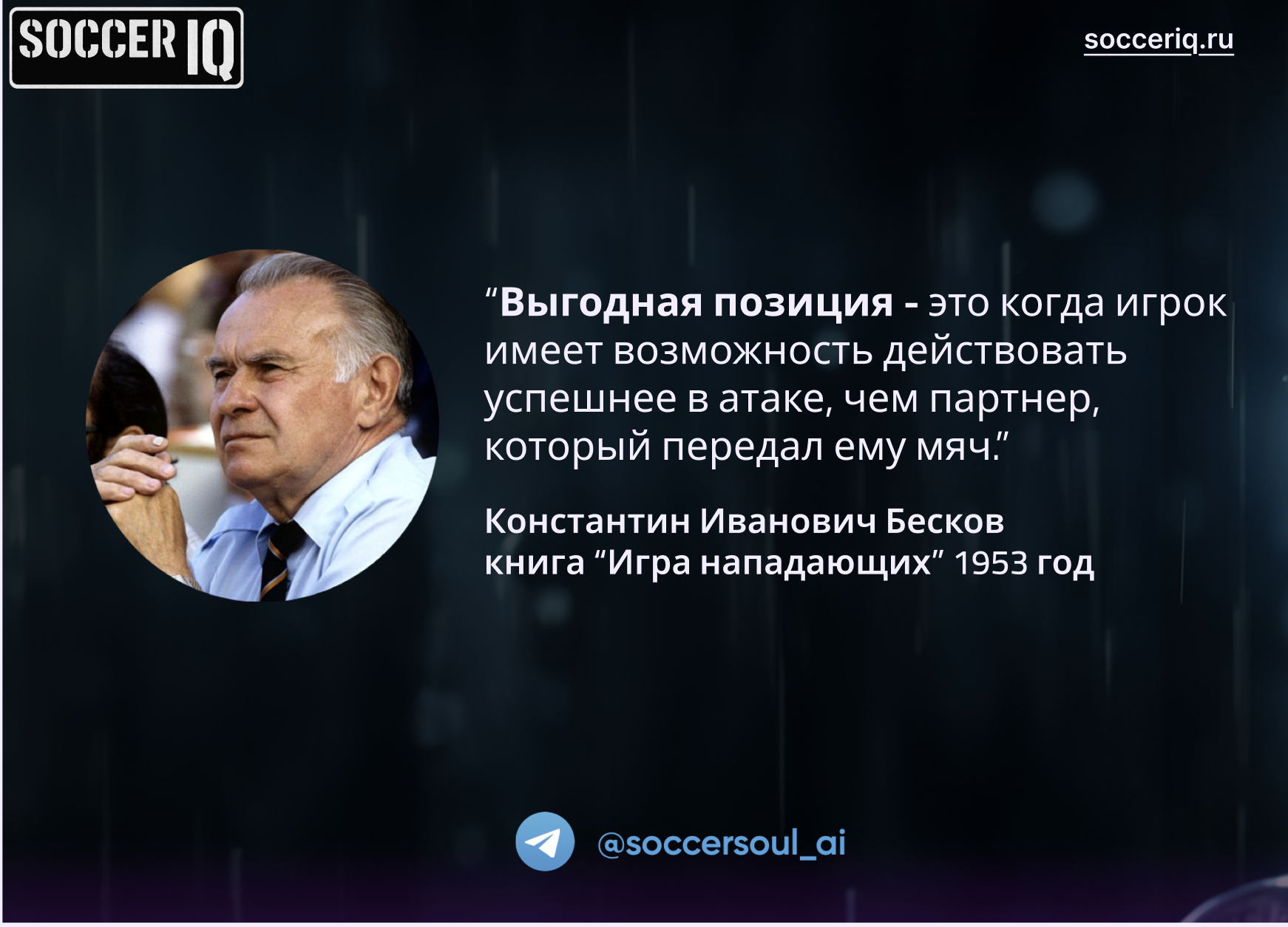 «Soccer IQ – модернизированная и улучшенная советская методика АВП (активно-выгодной позиции), берущая начало еще в работах Константина Ивановича Бескова, которая базируется на игровых элементах, влияющих на результат и поддающихся тренировке»