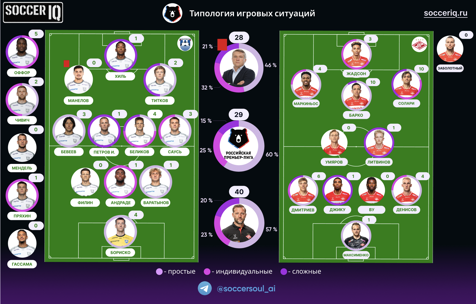 Серьёзной командной игры у Спартака не получилось. Были отдельные игровые ситуации, создаваемые отдельными футболистами, но коллективного футбола в игре было мало. С учетом позиционных перестановок и замен, с учетом итоговых показателей Soccer IQ футболистов старта и усиления, и, разумеется, в первую очередь с точки зрения сочетания маркеров качества, можно констатировать что тренер Талалаев переиграл тренера Романова, но тот этого похоже не понял.