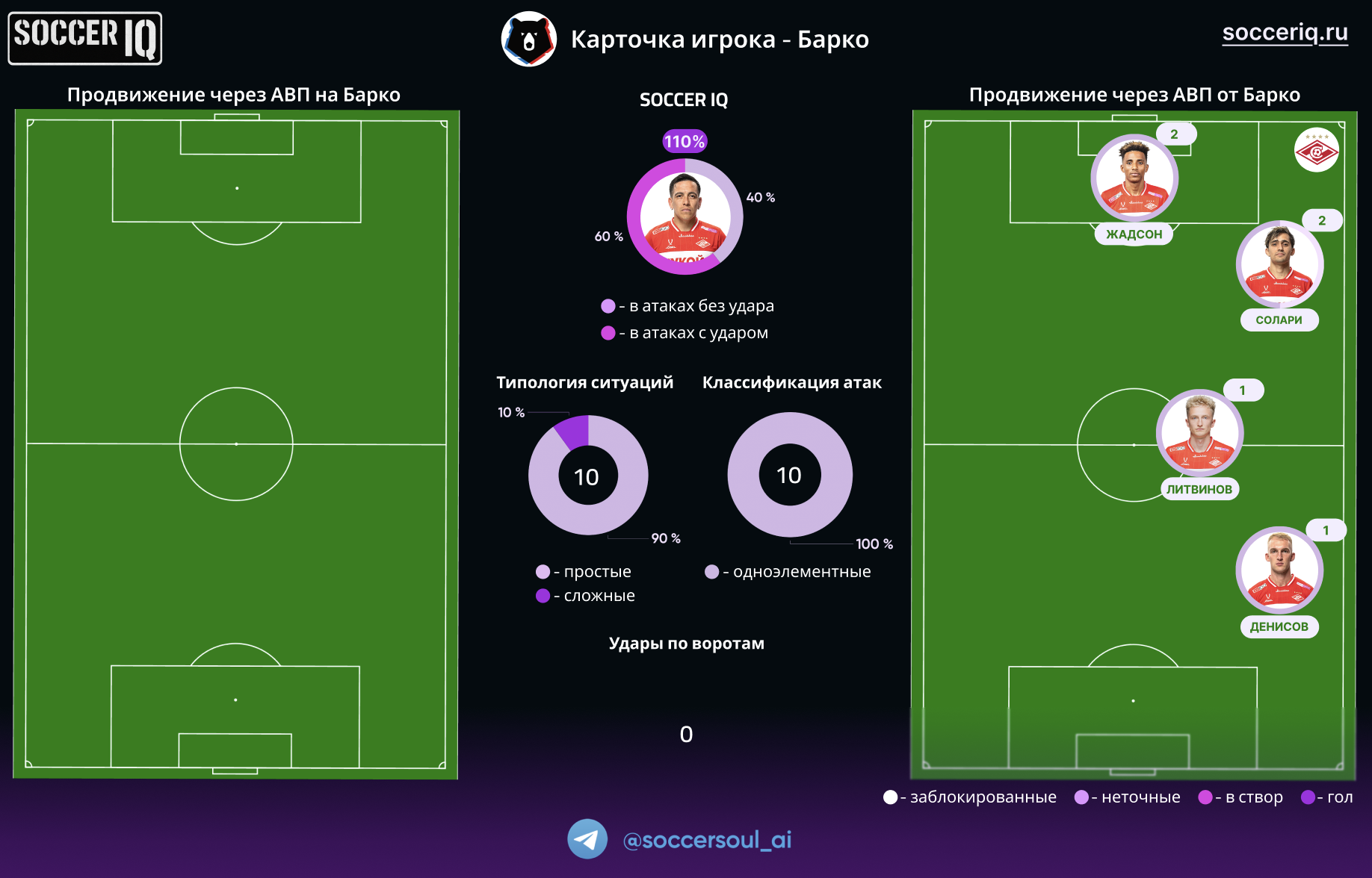 Мы снова видим серьёзный перевес Спартака в количестве атак (35 vs 18) и жёсткий просад по их качеству. 77% атак москвичей – это одноэлементные атаки, со статистической вероятностью забить – в 3%. 16 из 20 игровых ситуаций наиболее активных футболистов (Барко, Солари) пришлись на одноэлементные атаки и ожидаемо отстрелялись вхолостую. Но, самое удивительное, что при таком количественном отрыве от показателей остальных партнёров, эти игроки между собой взаимодействовали лишь дважды! Позиции обоих подразумевают активное участие в фазе развития атак, начинающихся защитниками или футболистами опорной зоны. Но, если Барко еще играл на партнёров, то на самого Барко за весь матч ни одной передачи через активно-выгодную позицию за всю игру мы не увидели ни из опорной зоны, ни с флангов! Мы наблюдали Барко и Солари чаще начинающими или пытающимися начать атаки. Взаимодействия второго с опорной зоной (Умяров, Литвинов) были минимальны, да и в целом за матч продвижение мяча о россиян под удар на иностранцев мы насчитали только два (оба от Денисова)!