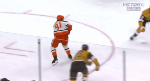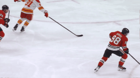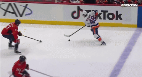 Появление: из жаркой хоккейной баталии на секунду вылетаем в режим разминки перед матчем. Смит с шайбой, кружит вокруг партнера и аккуратно так перебрасывает шайбу над ним.