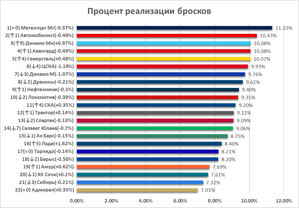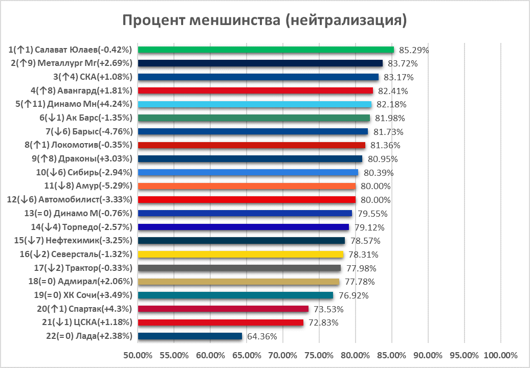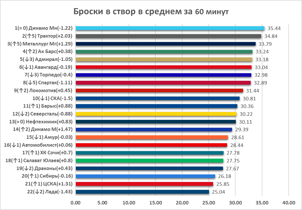 В заголовке статьи приведена диаграмма суммарного показателя команд по итогам ноября, иначе говоря, это можно назвать совокупной силой команды. Чем выше показатель, тем лучше команда себя показала в совокупности по основным игровым характеристикам на конкретном отрезке чемпионата. Эта сила получена из суммирования всех параметров кроме времени на реализацию большинства, времени на пропущенную шайбу в меньшинстве и PDO. Лучшая команда по каждому показателю получает 1,0 балл, а все другие команды получают пропорциональную оценку. Например, команда Динамо Минск имеет в среднем 35,44 бросков в створ (лучший показатель), а команда Лада – 25,04 бросков в створ, соответственно Динамо получает оценку 1,0, а Лада – оценку 25,44/35,44 = 0,71. Таким образом, все игровые компоненты являются равнозначными в суммарном показателе. В конце статьи приведена альтернативная диаграмма, где вместо процента на реализацию и нейтрализацию численного неравенства учитывается соответствующее время.