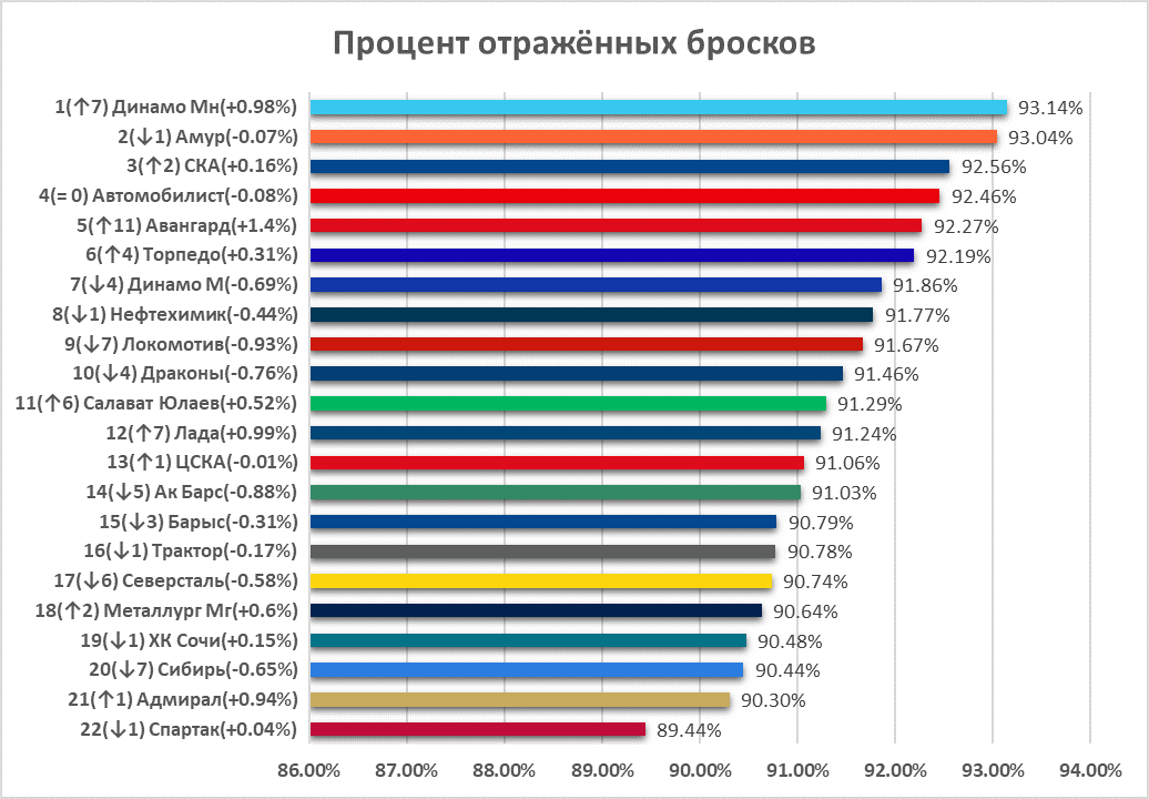 PDO – это комплексная статистическая метрика, используемая в NHL, чтобы оценить «удачу» команды. PDO вычисляется как сумма процента реализации бросков и процента отраженных бросков. Суть данной метрики состоит в том, что на основе статистических наблюдений сезонов NHL было выявлено, что данная величина всегда варьируется около 100%. Нормальным отклонением считается диапазон 99%-101%, если же процент лежит в диапазоне 98%-102% – это может говорить о заметной неудаче-удаче команды соответственно, если же значение еще больше отклоняется от нормы, то это считается сильной аномалией, которая должна будет выровняться на дистанции. Например, если обратиться к значению PDO для команд в прошлом регулярном чемпионате КХЛ, то можно увидеть, что лучший показатель 102,61% был у Салавата Юлаева, а худший 96,15% у Барыса (99,05% у Северстали – среди команд, вышедших в плей-офф). При этом среднее значение по лиге – 100,49%. Ранее я не сталкивался с применением PDO по отношению к КХЛ, предлагаю вместе понаблюдать за динамикой изменения данного параметра.