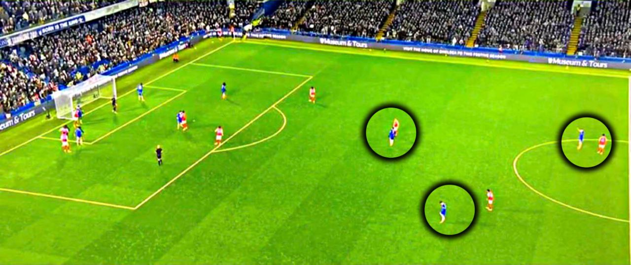 Яркий момент — угловой у ворот Санчеса, а 3 футболиста «синих» стоят в центральном круге, ожидая контратаку (ну и плюсом вытягивая из своей штрафной 3-х соперников).