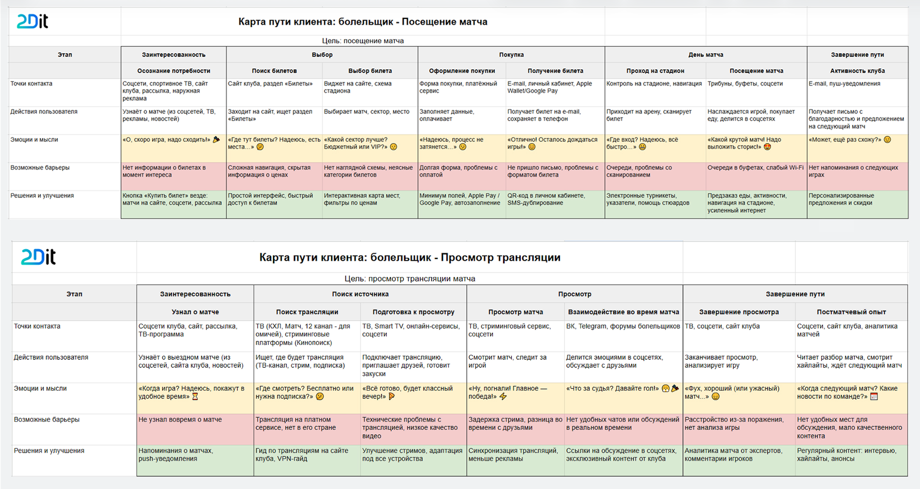Для каждого сценария была составлена отдельная таблица, где выделены возможные точки контакта, действия пользователя, эмоции и мысли, возможные барьеры и предлагаются улучшения.