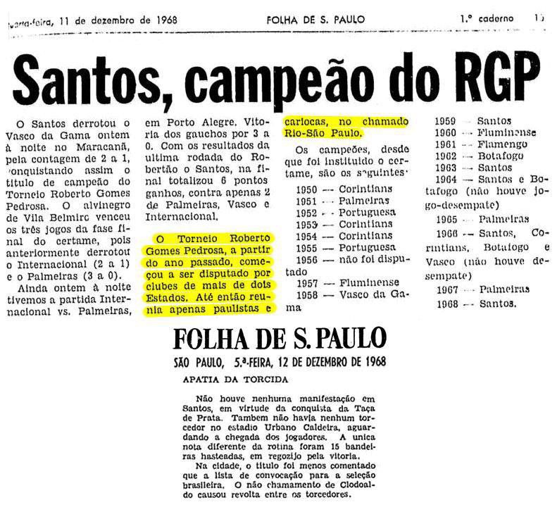 В 1968 году «Сантос» выиграл TRGP после 16 туров первого кругового турнира и трех игр в финальной группе с «Интернасьоналом», «Палмейрасом» и «Васко». Taça Brasil, к тому времени уже значительно потерявшая в авторитете, даже не был разыграна.