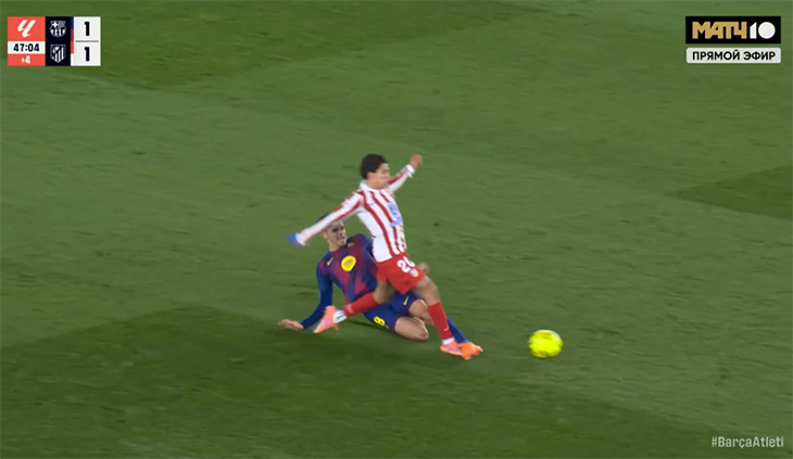 «Атлетико» подсел в защиту, отвечая редкими контратаками. «Барса» пыталась взламывать и к 36-й минуте заработала пенальти: полузащитник Пабло Барриос сфолил на Ольмо. Судья указал на точку.